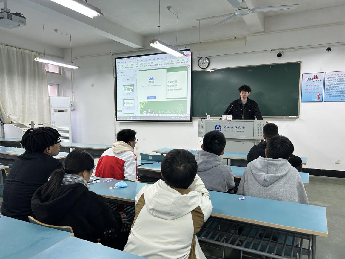 在宣讲活动的开始,张晏铭老师从选择征兵入伍的思想层面进行的动员,张老师结合学校所处地舟山的重要战略地位,我校大学生征建用等贴近学生实际的情况以及近年来党和国家对军队建设的高度重视,军人这一职业在面临社会突发情况发挥的巨大作用,从思想层面来阐述国无防不立,民无兵不安,征兵入伍工作对于国防事业的重要性紧迫性,号召有意向入伍的同学们坚定理想信念,励志报效国家。