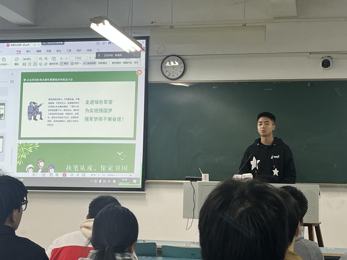 张老师向同学们解释了近年来征兵入伍政策的一些变化,两征两退政策和征兵入伍兵源优先从毕业生中选拔。分析了这些政策对应到大学生所带来的多重影响,特别是毕业生兵源占比达到60%这一政策给大四毕业生带来的机遇。他指出,有意向入伍的同学要对政策变化及时了解,做到心中有数。对应政策,自身要早日谋划,积极准备,主动作为,力争能够早日入伍。