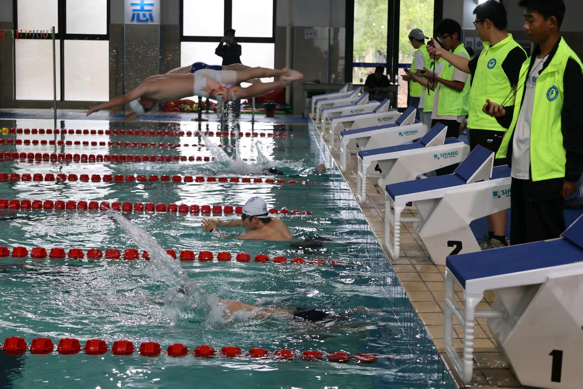 上午九时,一声哨响,宣布热血又沸腾的游泳比赛正式开始。转瞬之间,泳池里浪花四溅奔涌,经管的选手们宛如蓄势的蛟龙猛然扎入水中,他们在碧波中摆臂、换气、冲刺,动作干脆,势头强劲,场边观众的欢呼声与加油声震耳欲聋,都在为拼搏的健儿呐喊助威,现场气氛激昂高涨。