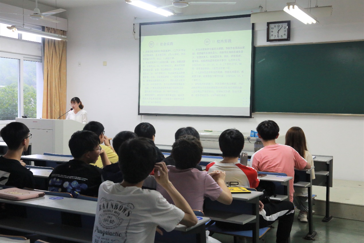 三位老师先从“志愿公益、社会实践、校内实践、文化体育活动和社团经历”五大模块展开,为同学们详细介绍了我校德育课堂模块与学时评定标准。接着,老师们以“为什么要参加学科竞赛”为切入点向同学们发问,指出参加学科竞赛不仅可以增强专业能力、提升专业素质,还能培养大学生顽强的意志、团结协作的精神和分析处理问题的能力,最终促进综合素质的提高,为自己的简历“增光添彩”。随后,老师们为同学们详细介绍了学科竞赛的类别,针对同学们关心的省级A类、B类竞赛,以及新苗计划、国家级大学生创新创业项目、大学生科研创新计划进行了耐心细致的讲解。老师们还从学校和学院两个层面为同学们解读了学科竞赛的奖励措施,表明学校和学院领导对学科竞赛工作的重视和以竞赛推动学风建设、助力人才培养的决心。