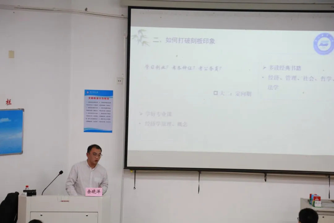 对于情商的培养,余晓洋老师从“如何去说话”和“如何提升执行力”两个角度分享了自己的见解。对于阅读习惯的培养,余晓洋老师为同学们分享了他常用的阅读APP和软件,并以经济学书籍阅读为例,分享了他对于阅读习惯养成与兴趣培养的心得体会,让同学们明确了读书的目的与方法,进一步确定了奋斗的目标。对于身心健康的培养,余老师提醒同学们要合理作息,加强体育锻炼,积极参加社团活动,不要把自己“藏”起来,因为一切都是最好的安排。