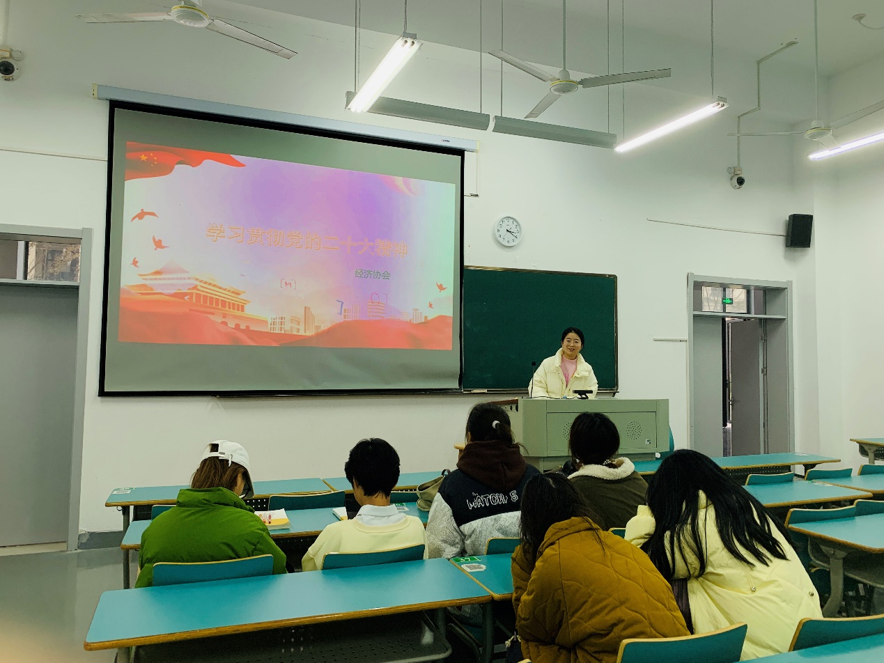 经济协会社长徐颖异以《青年强,则国家强》为主题,围绕二十大报告中总书记对青年的勉励,带领社员们认真研读了二十大报告。在学习之后,社团成员深刻认识到:要把个人成长与国家发展、民族复兴大业结合起来,积极投身全面建设社会主义现代化国家各项事业,在火热实践中经受锻炼、增长才干,努力成为堪当民族复兴重任的时代新人。