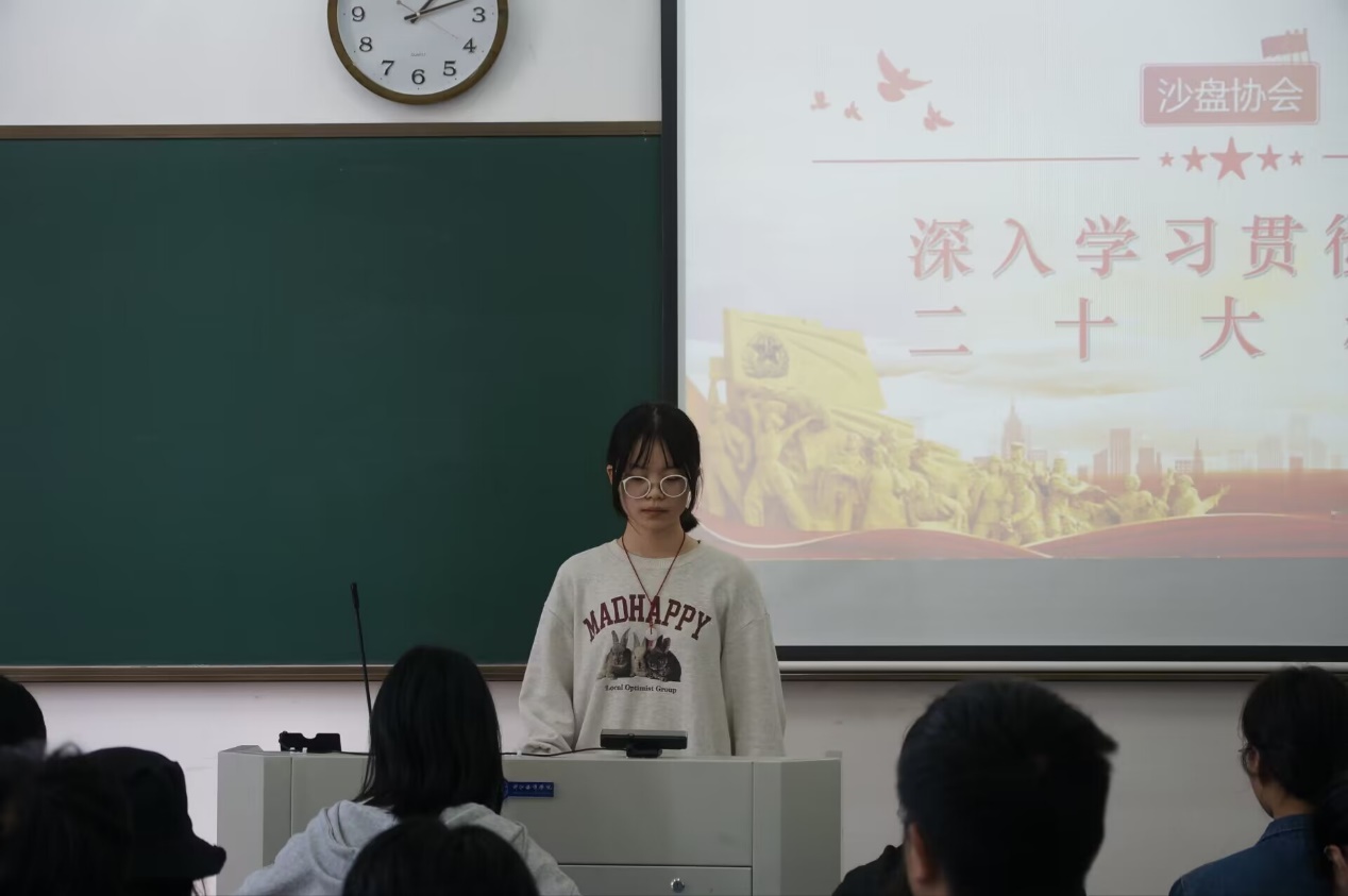 “海洋之星”沙盘协会社长潘芝伊从党的二十大的重大意义入手,延伸到对当代青年的启示。作为新时代青年,这是建功立业的大好际遇,更是传承历史,开拓未来的神圣责任。经过本次宣讲,社员意识到,新时代青年不仅要把握过去5年工作和新时代10年伟大变革的重大意义,学习贯彻习近平新时代中国特色社会主义思想的世界观和方法论,也要牢牢把握以中国式现代化推进中华民族伟大复兴的使命任务,争做勇担青春使命的时代新人。