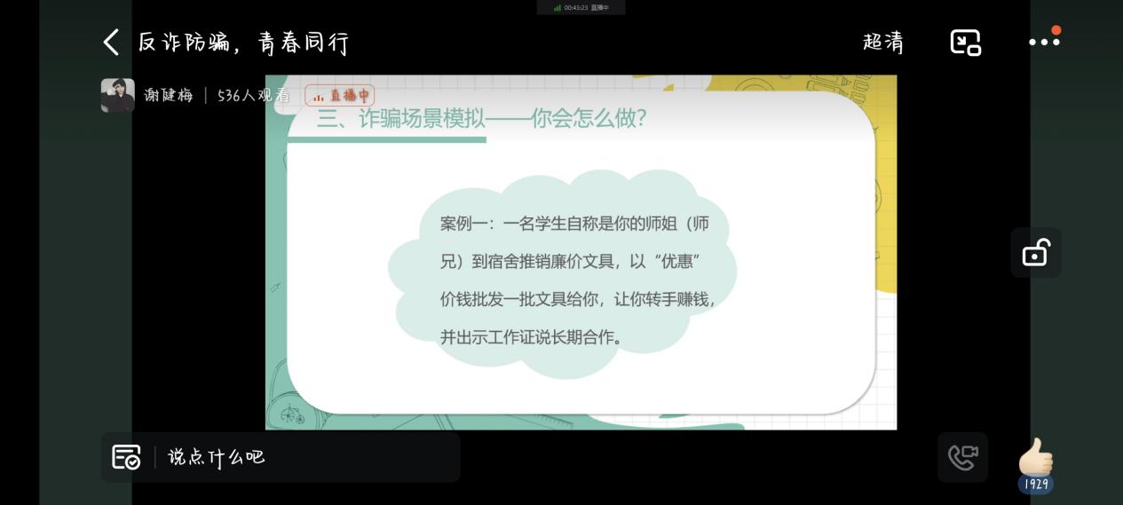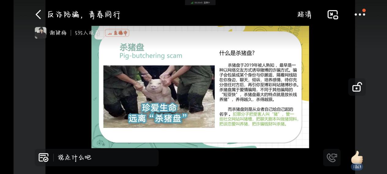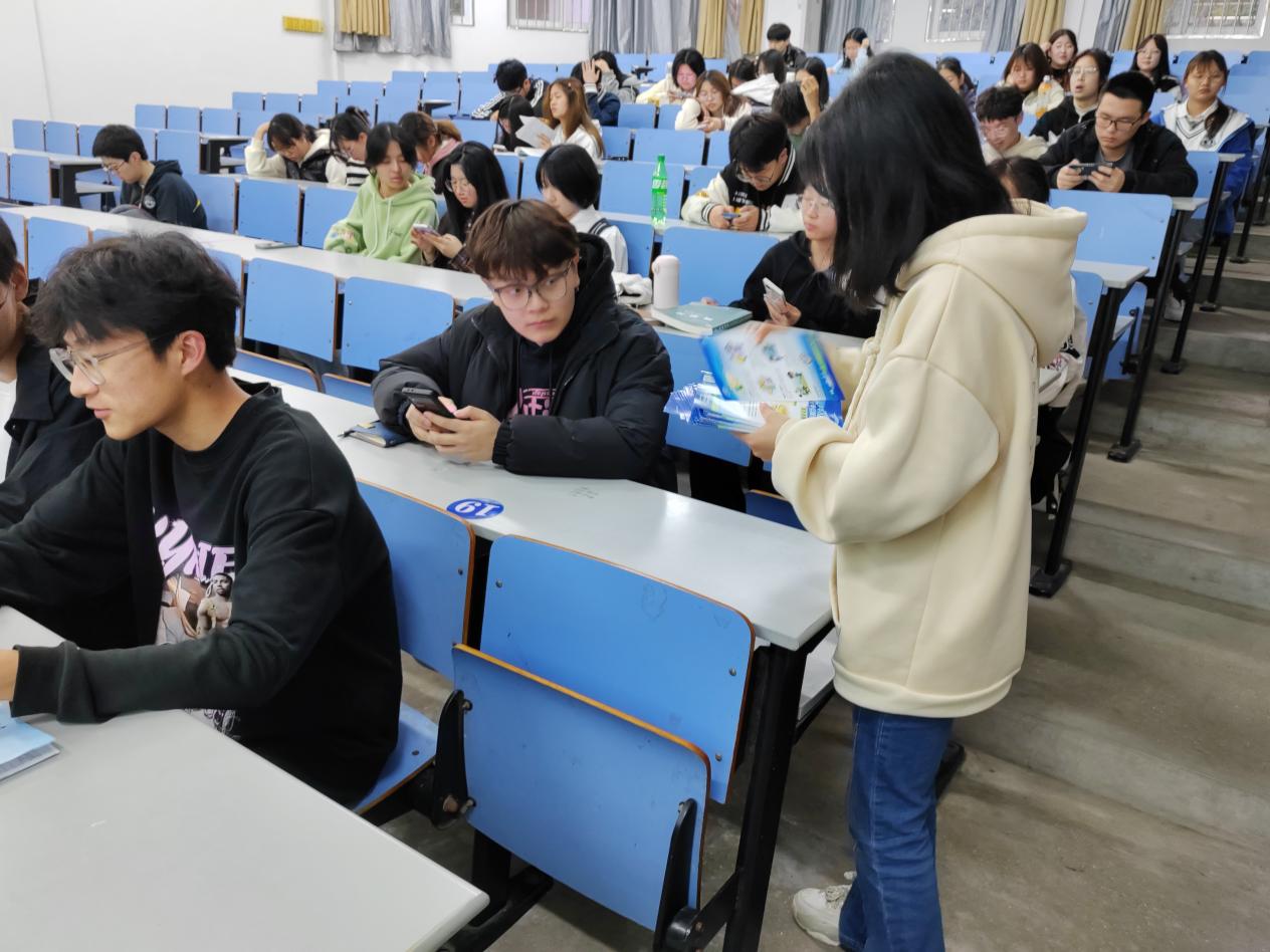 为进一步提高我院同学的反诈意识和反诈能力,谢健梅同学还带领线上线下的全体同学开展了反诈知识竞赛宣传活动,并赠送小礼物。题目内容涉及“杀猪盘”、刷单返利、庞氏骗局、校园套路贷、诈骗电话等常见诈骗类型。同学们热情满满,纷纷参与竞赛答题。A20经济2刘钗同学表示,反诈知识竞赛紧紧围绕揭露电信网络诈骗的惯用手段、作案方式、规律特点等方面,题目新颖多样,让大家在轻松的答题氛围中学习到了许多反诈知识,寓教于乐,宣传防骗的效果更为显著。谢健梅还给在场同学分发了反诈宣传单,详细讲解了各类常见高发的诈骗形式和案例,让同学们深入了解了反诈常识、树立了反诈理念。