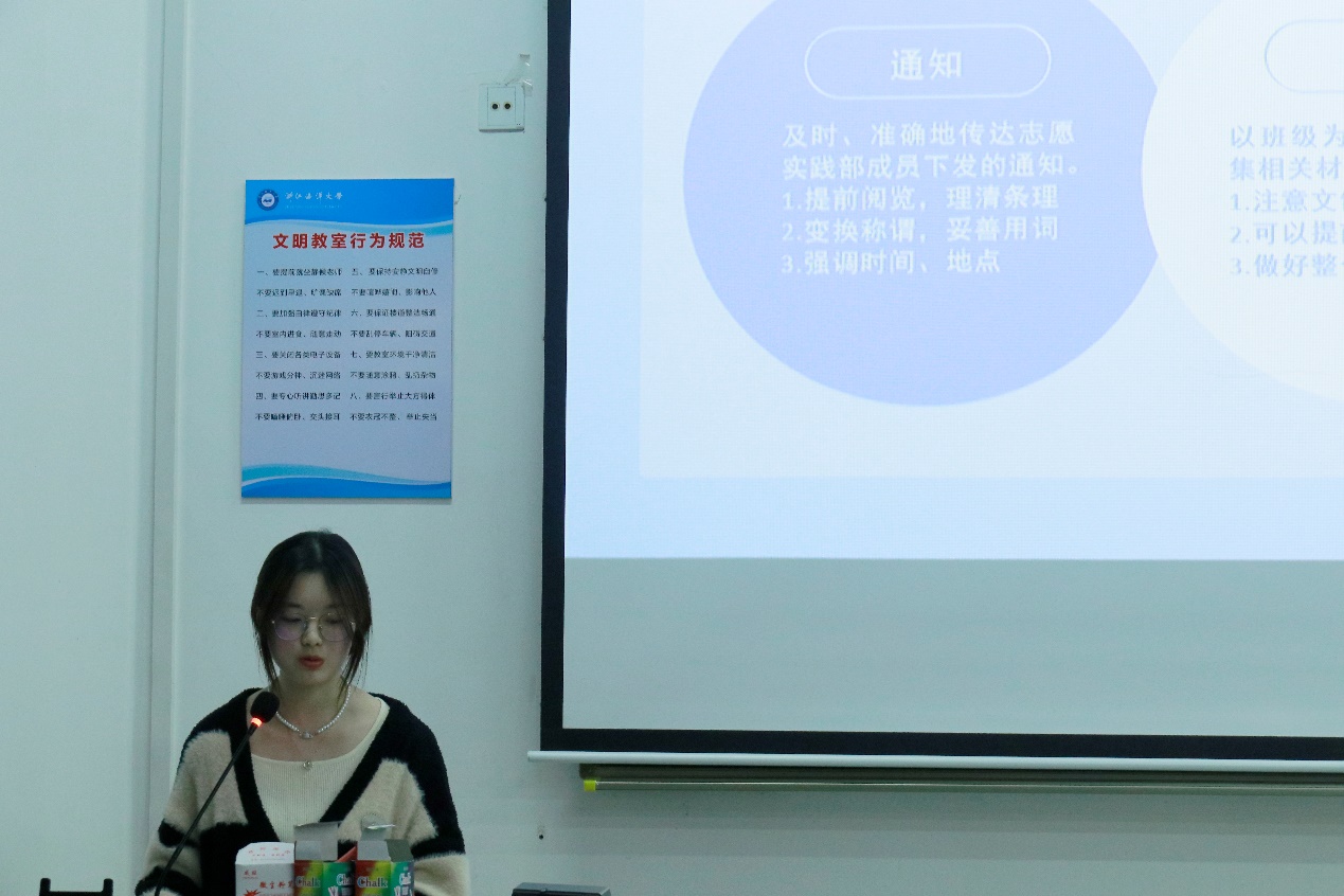 团委志愿实践部副部长范思懿同学和负责干事杨艳姿同学从职责明确、校外志愿、注意事项三个方面,对各班组织委员进行了志愿服务相关流程的再次培训。会议指出,组织委员首先应明确自身职责,及时、准确地在班内完成通知、收集和反馈三方面的工作。针对校外志愿,她从志愿申请、志愿认定、时长发放等方面进行了详细介绍,同时也针对邮箱发送、材料装订、活动发布、黑名单制度等注意事项进行了充分强调。
