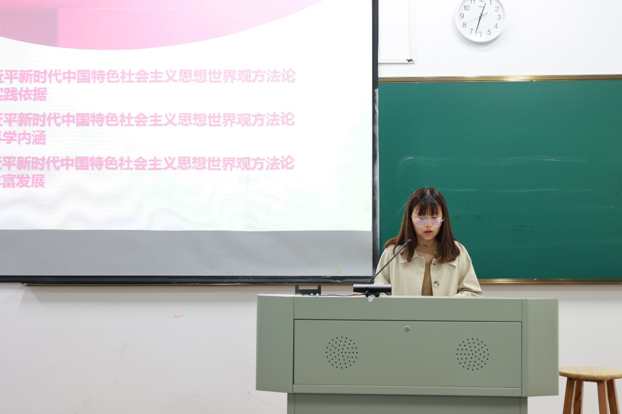 朱晨晨老师从实践依据、科学内涵和丰富发展三个层面,为全体团学干部深入解读了习近平新时代中国特色社会主义思想的世界观方法论。朱老师特别强调,“十个明确”“十四个坚持”“十三个方面成就”构成了习近平新时代中国特色社会主义思想的主要内容。而党的二十大报告提出的“六个坚持”,又是对“十个明确”“十四个坚持”“十三个方面成就”的高度凝练概括。朱老师还围绕“六个坚持”与“十个明确”“十四个坚持”“十三个方面成就”、三大时代课题之间的内在逻辑关系,结合个人实际,分享了自己的感悟与见解,并指出学习习近平新时代中国特色社会主义思想一定要和丰富生动的实践联系起来理解把握。