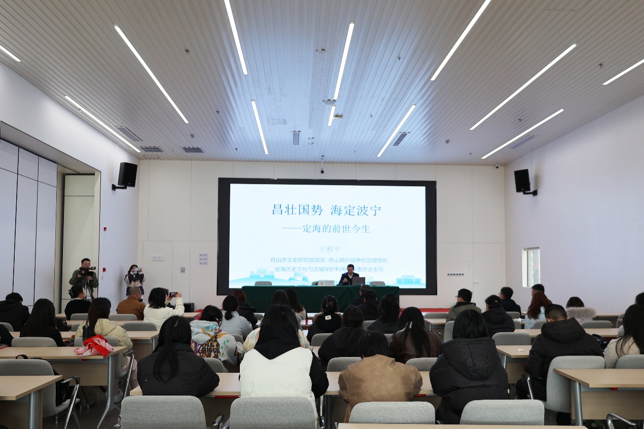 王和平主任结合自身深厚的学术积累与对地方文化的深入研究,以时空为轴,紧扣历史发展脉络,带领同学们回溯定海的历史沿革。他从古老地名的演变谈起,细致阐述了定海在不同历史时期的变迁,强调了定海在国家战略布局中的关键地位。特别是他对定海作为“鸦片战争首战地,近代史端定海城”的深度剖析,使大家清晰地认识到定海在中国近代史上独特而重要的价值。