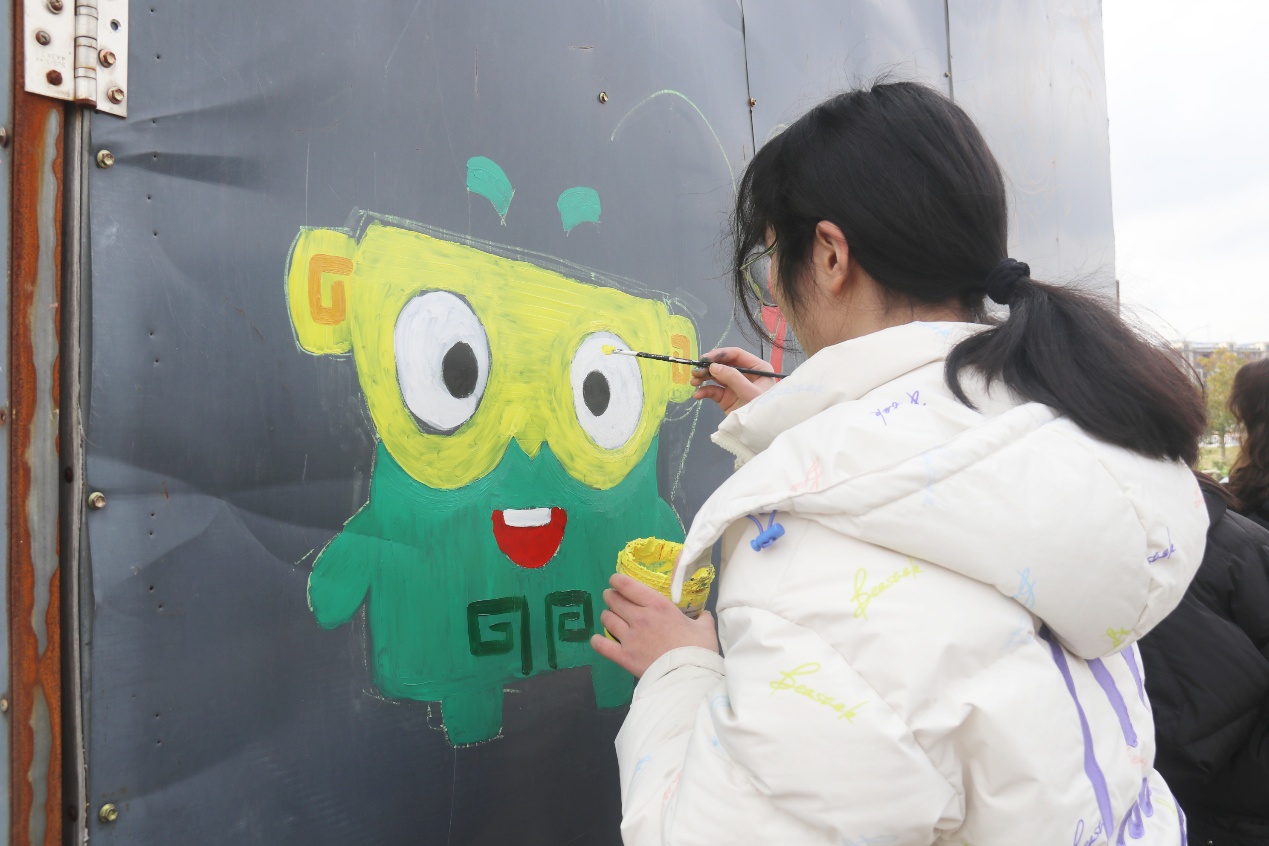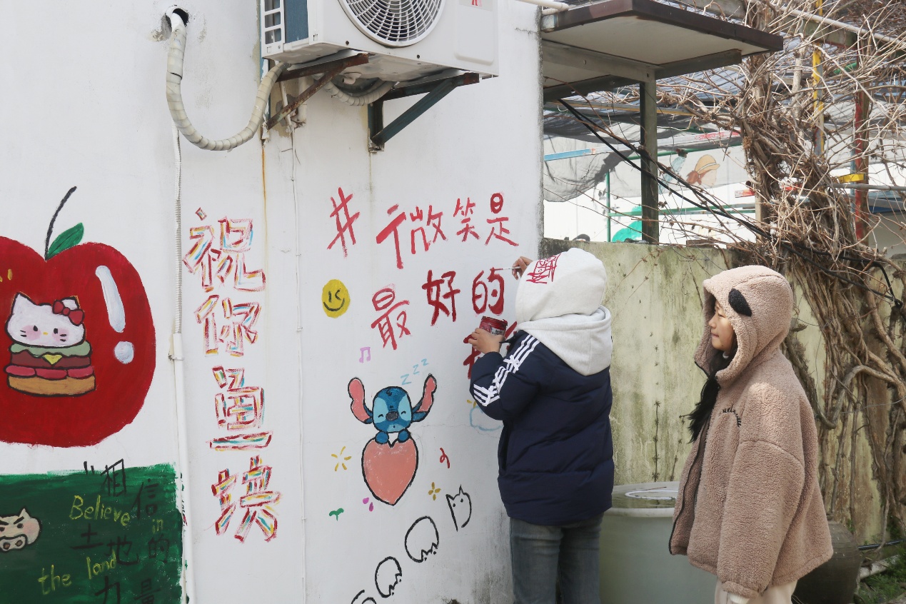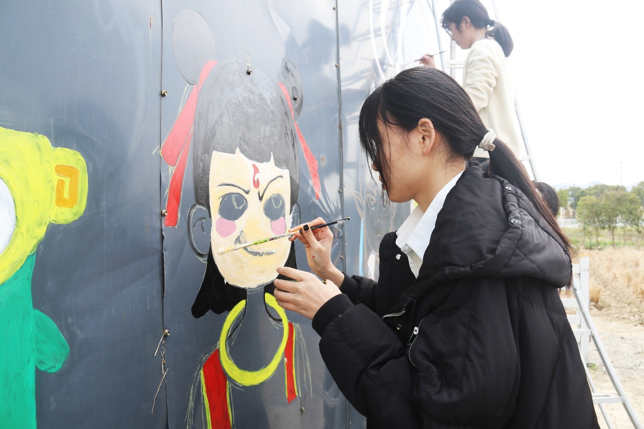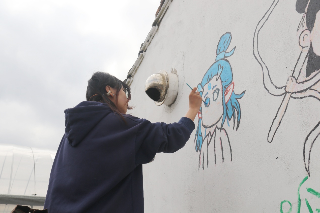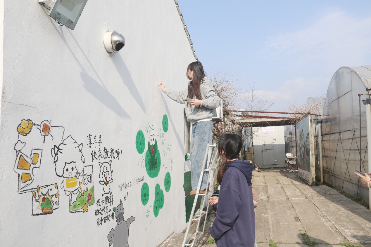 在农场房外墙这张广阔的画布上,志愿者们还化身为富有创意的艺术家,轻轻拿起手中的画笔,将满腔的热情与无限的想象力挥洒在田园之中。志愿者们或蹲或立,在墙上认真勾勒每一个细节,用色彩描绘希望。创作过程中,大家相互交流灵感、分享创意,欢声笑语回荡在每个角落。哪吒、敖丙、Hello Kitty、喜羊羊、懒羊羊……每一笔、每一色都饱含着他们对自然与美的热爱。不一会儿,一幅幅充满童趣与幻想的作品跃然墙上,为质朴的农场增添了一抹别样的绚丽。