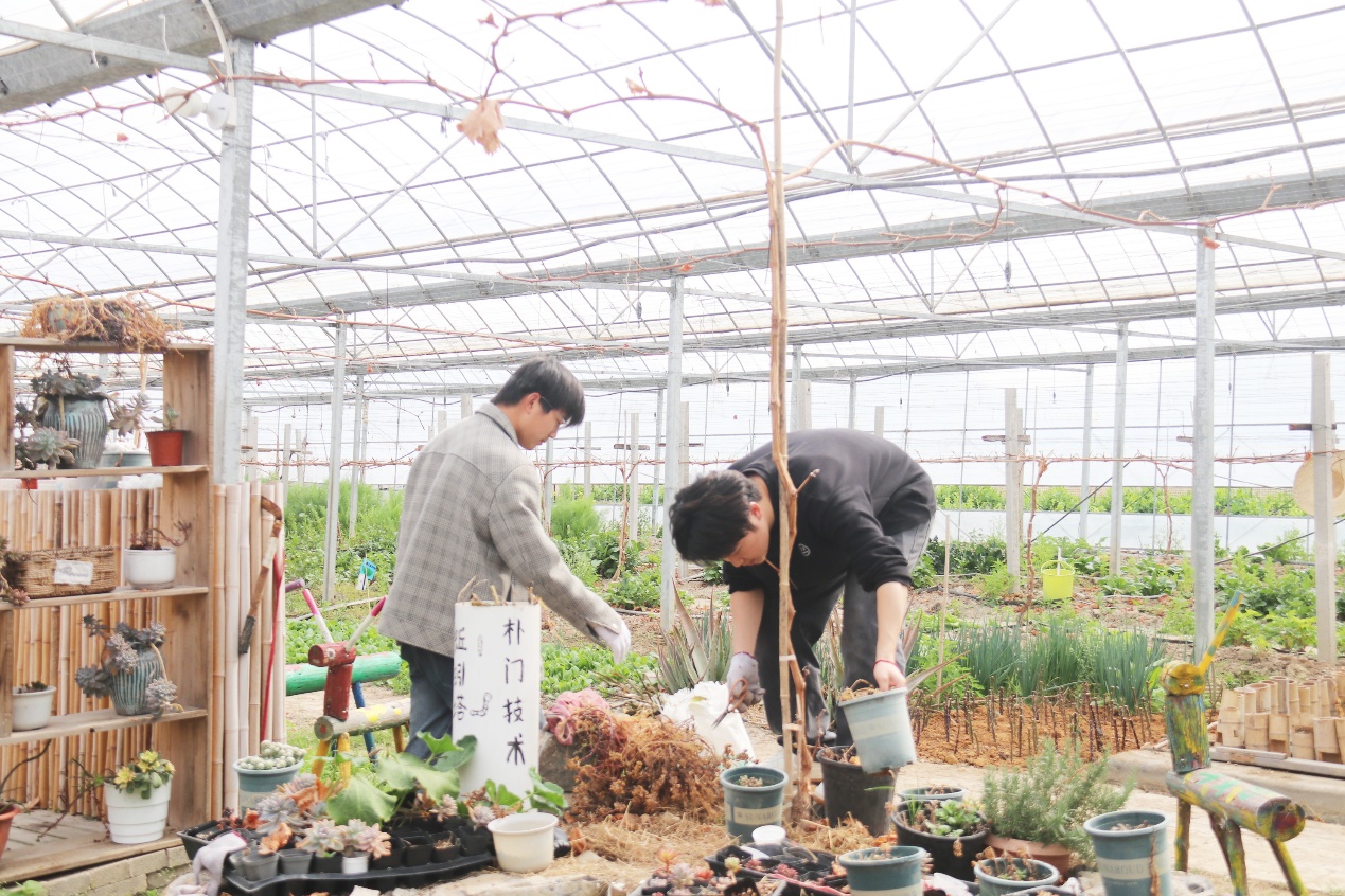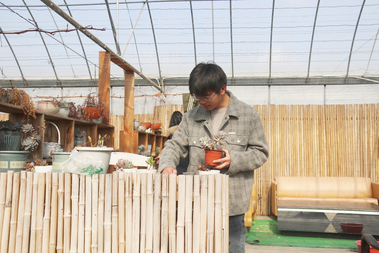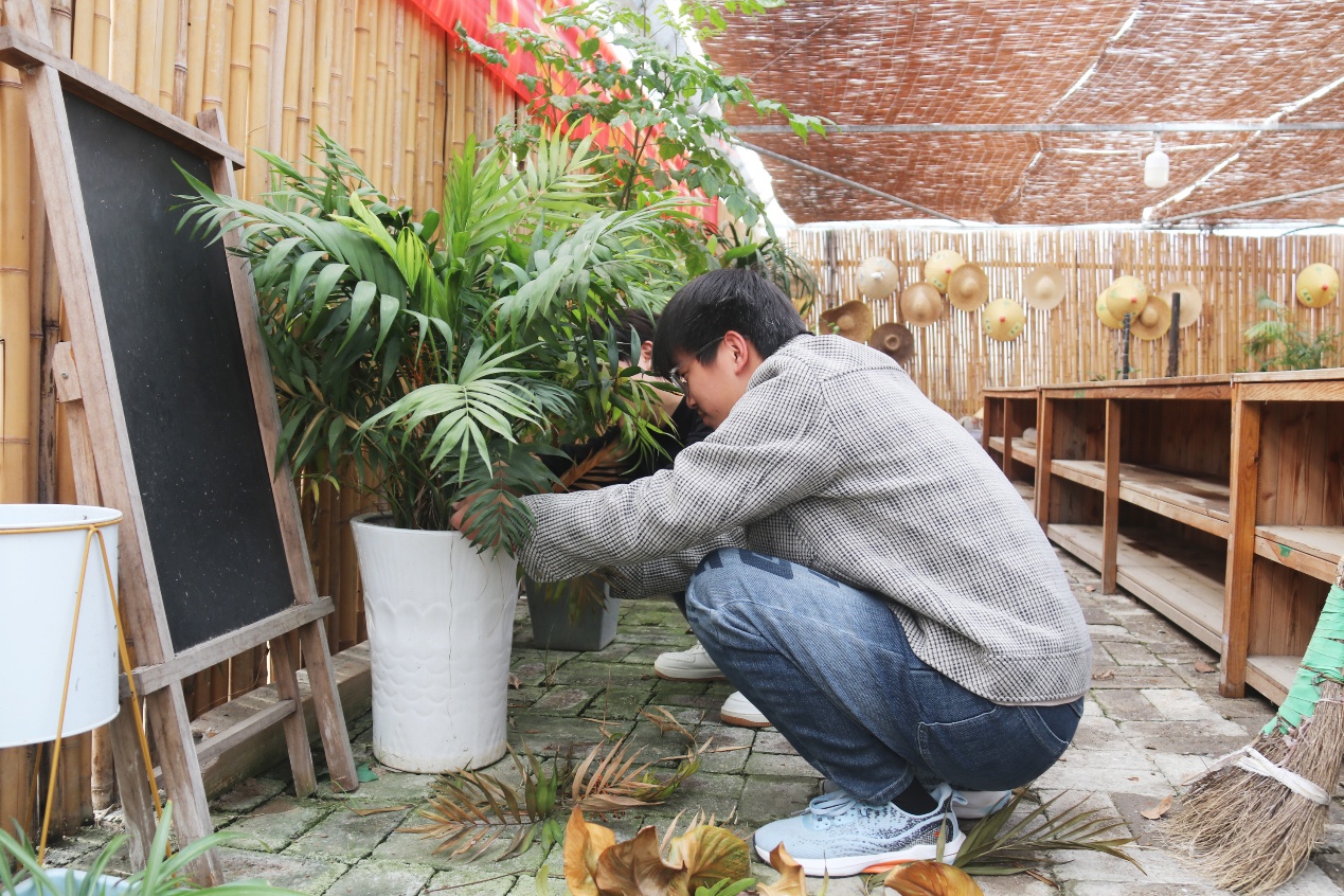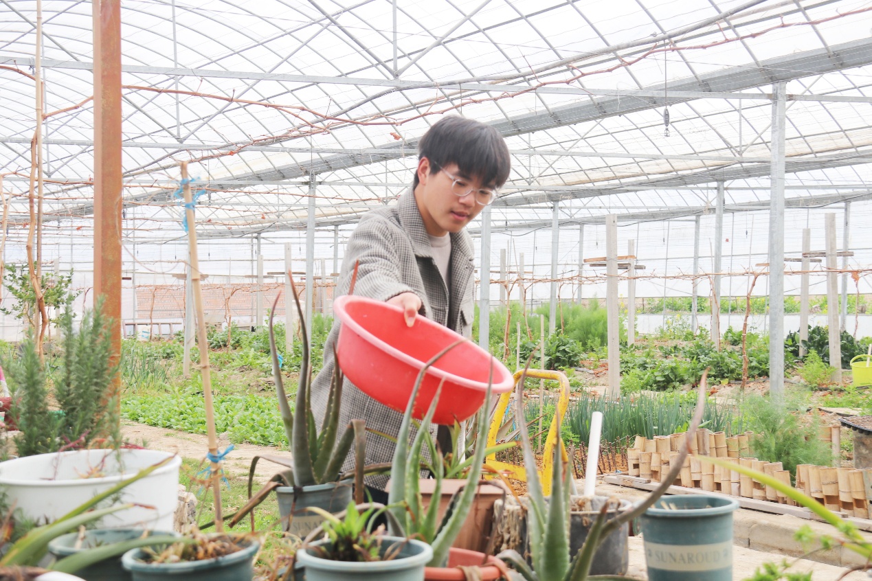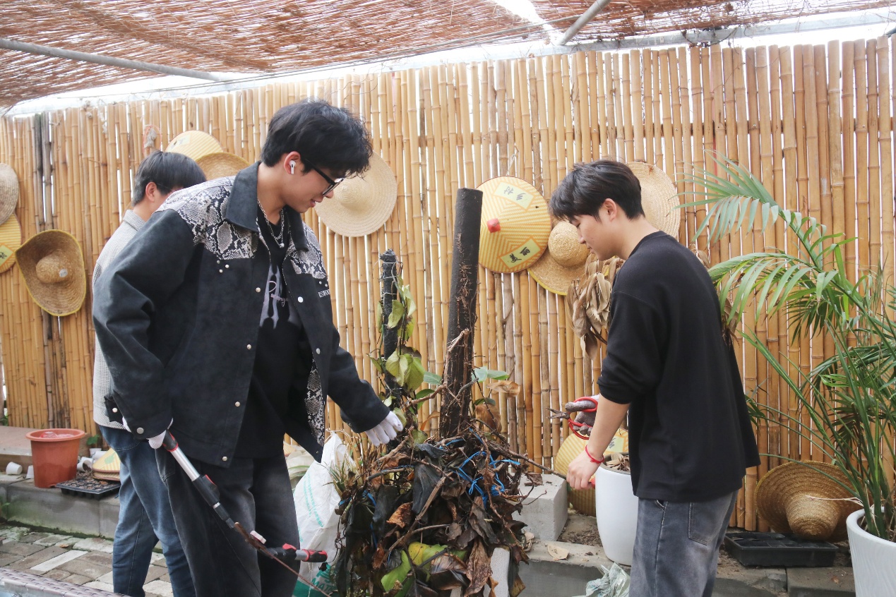 在绿植区,经管志愿者们分工协作、配合默契,迅速投入到绿植的整理与养护中。有人负责规划摆放,为每一盆绿植找到最合适的位置;有人小心翼翼地搬运,将绿植错落有致地排列,营造出层次丰富、和谐美观的效果。灌溉环节更是一派忙碌景象。志愿者们端着水盆,穿梭在绿植间,缓缓将水倒入土壤中。他们仔细检查,确保每株绿植都能“喝饱”甘露。修剪枝叶时,志愿者们手持剪刀,专注而细致地为每株绿植“修整造型”,让植物焕发新生。经过同学们的辛勤劳动,原本略显杂乱的绿植区变得井然有序,为这片田园增添了盎然春意和勃勃生机。