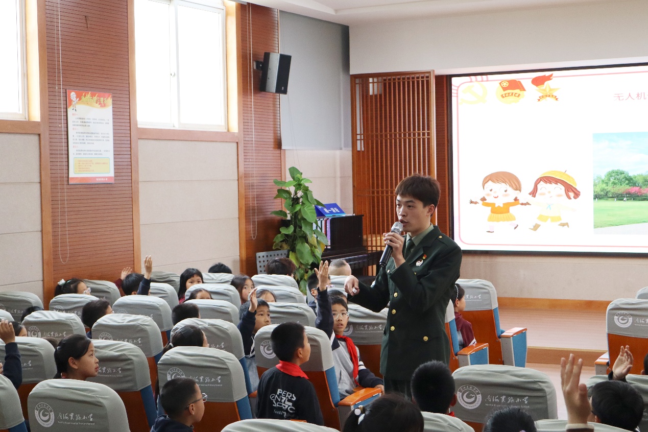 校国防青年先锋连的退役大学生们结合自身军旅经历,分享了他们在军营中的成长故事,从日常训练的艰辛到执行任务的光荣,用真实的经历诠释“雷锋精神”在新时代的实践。他们讲述了如何在部队中锤炼意志、培养团队精神,以及如何将这种精神带回校园,融入学习和生活。他们鼓励少先队员们珍惜当下的幸福生活,从小树立爱国情怀,关心国家安全,努力成长为有理想、敢担当、能吃苦、肯奋斗的新时代好少年。“将雷锋精神和国防教育带入校园,不仅能在少年儿童心中埋下爱国的种子,更能促使他们以实际行动践行责任担当,为国防事业注入新活力。”yl88858永利集团退役大学生洪哲楷这样表示。