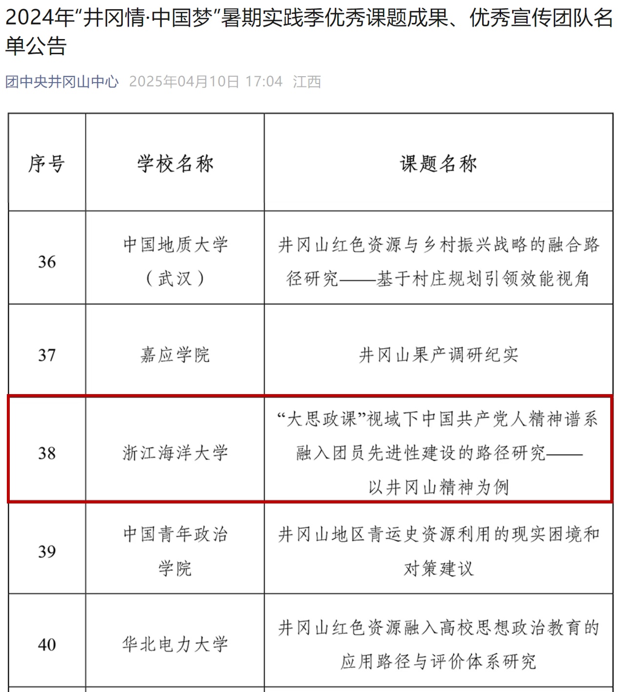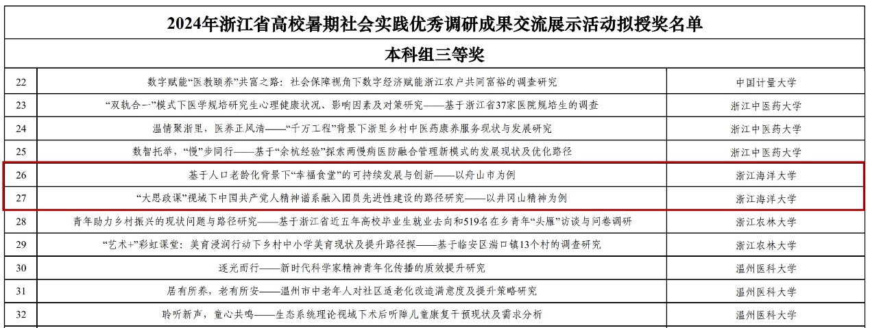 近日,由团中央青年发展部、全国青少年井冈山革命传统教育基地管理中心组织开展的2024年“井冈情·中国梦”全国大学生暑期社会实践专项行动优秀成果评选结果揭晓。yl88858永利集团“山海相约,‘冈’好‘屿’见”实践团的课题《“大思政课”视域下中国共产党人精神谱系融入团员先进性建设的路径研究——以井冈山精神为例》获评“优秀课题成果”,全国仅75件作品获此荣誉,浙江省高校唯一一项,也是学校连续第二年获评。