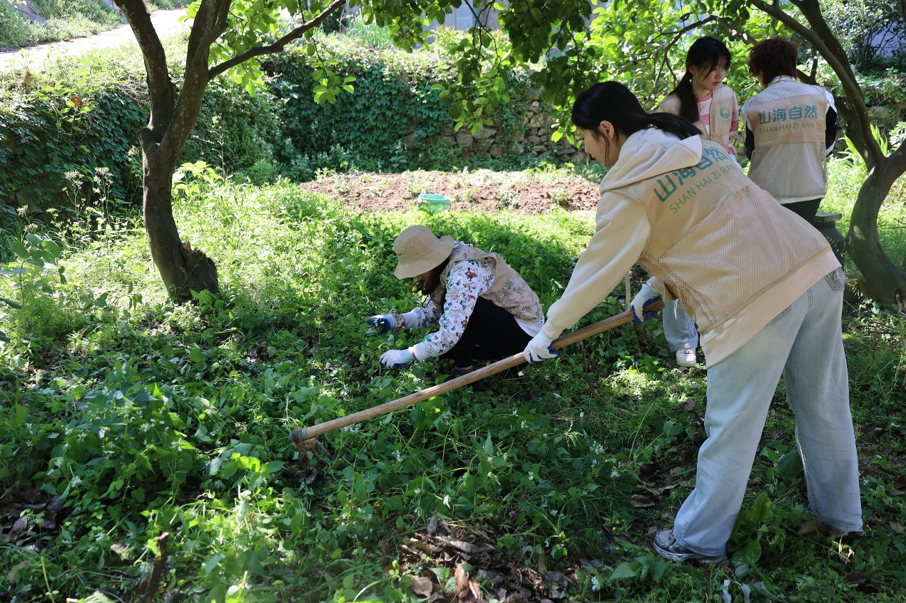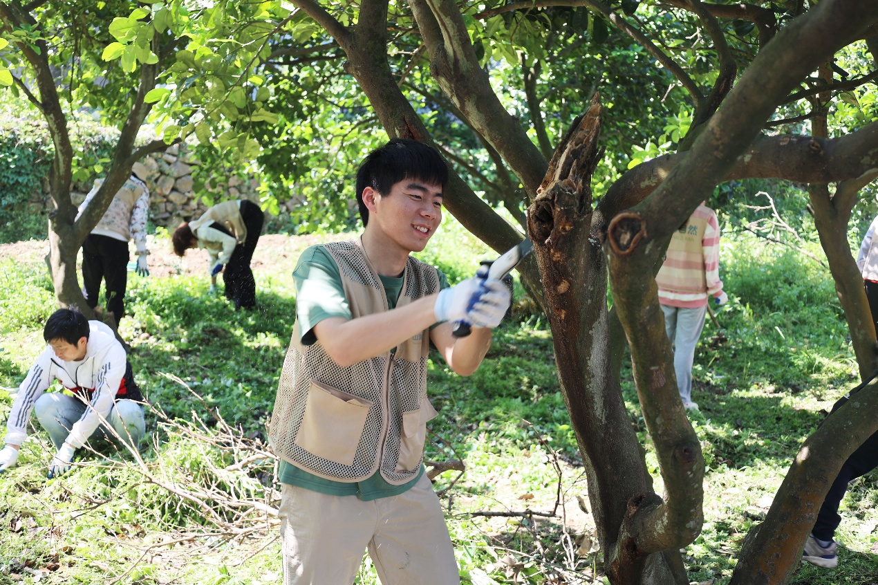 随后,志愿者们迅速分成若干小组,投入到果园的实际劳作中。面对杂草丛生、枝枒交错的果园,大家毫不退缩,挽起袖子、拿起工具,热情高涨地投入到劳动中。有的同学弯腰持镰,耐心细致地清除田地中的杂草;有的则专注修剪枯枝,动作轻柔而精准,生怕伤及果树本体。虽然阳光炽烈,裤脚早已沾满泥土,但每一位志愿者的脸上始终挂着满足而灿烂的笑容。