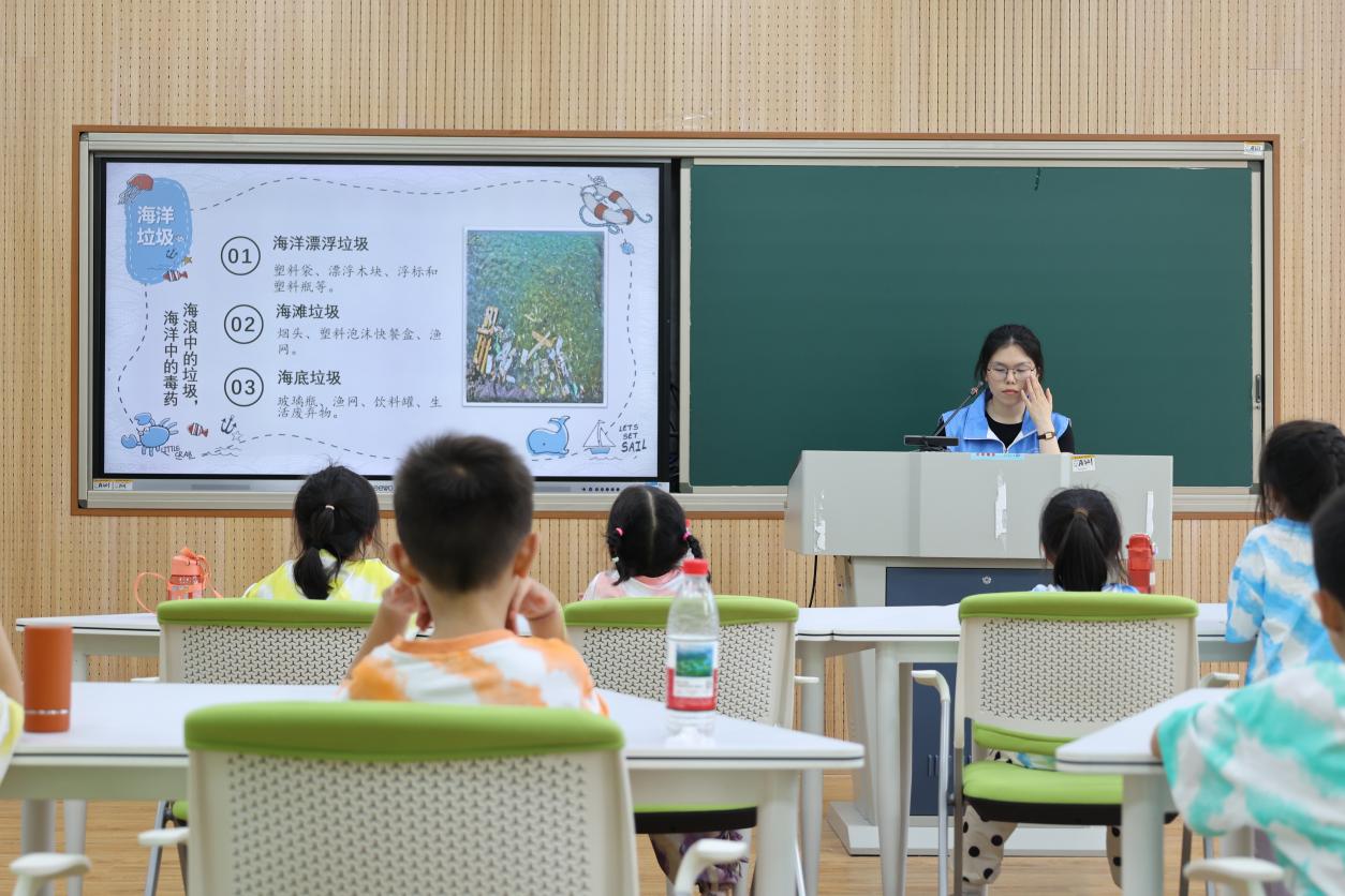 减塑小课堂以博物馆参观为延伸,通过“认知-思辨-实践”三维体系深化青少年环保意识。“蓝海塑净”研究生志愿服务团队在专题教室内,依托多媒体教学手段,系统阐释塑料污染全链条,直观呈现塑料垃圾对海洋生态的物理伤害与化学侵害。以问题链驱动思维,引导这群渔村的小朋友反思日常生活场景中的塑料制品使用,通过“可降解替代品”“重复使用方案”等开放性问答,构建个体行为与海洋保护的逻辑关联。