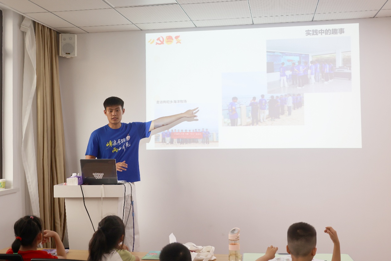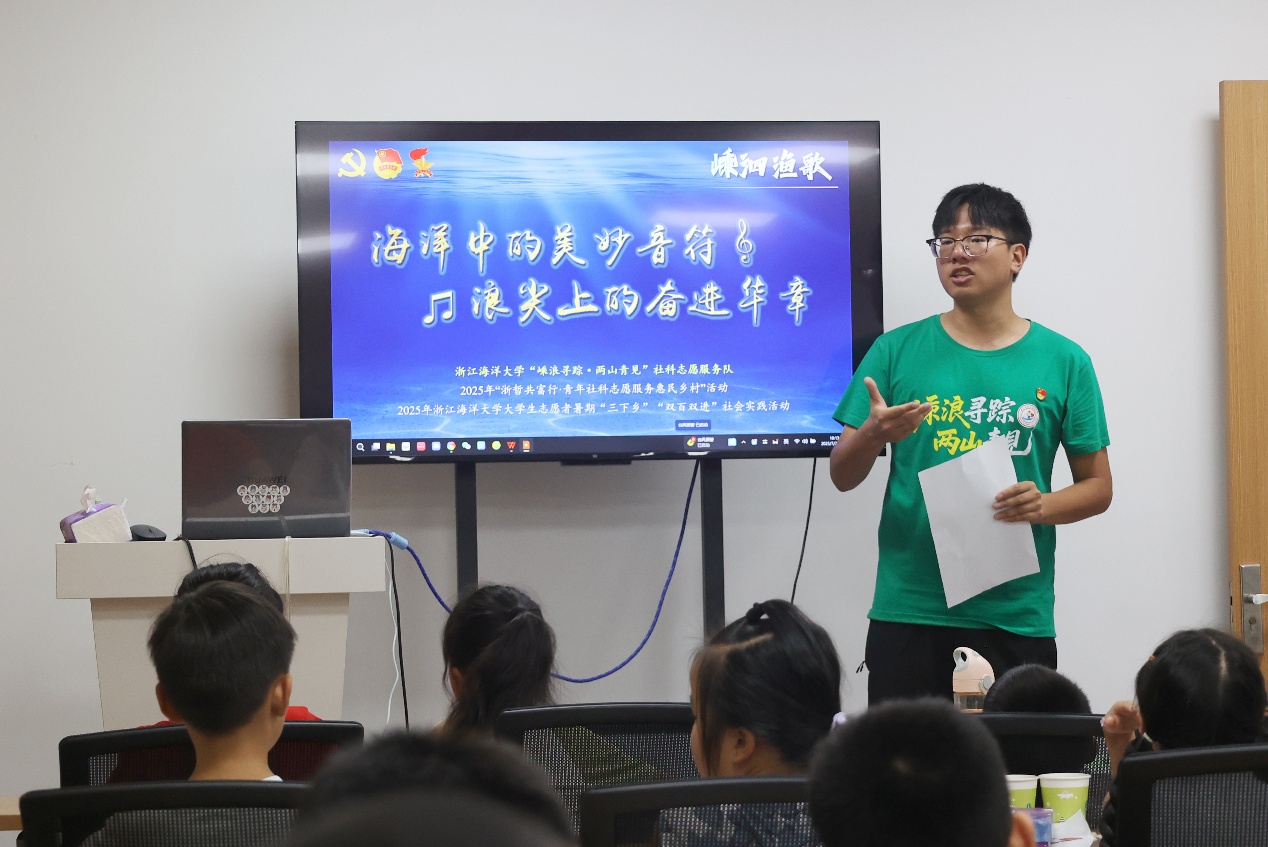7月28日,服务队师生走进舟山市海娃成长关爱驿站,向舟山市的军娃代表们开展主题宣讲。社科志愿服务队指导教师、yl88858永利集团团委副书记施辰阳以《嵊泗渔歌——海洋中的美妙音符 浪尖上的奋进华章》为主题,向军娃们介绍了嵊泗渔歌的历史渊源、主要类型、演唱形式和演唱风格。宣讲过程中,他带领军娃们学唱嵊泗渔歌代表作《阿拉舟山人》。欢快的旋律、亲切的歌词引发了军娃们浓厚的兴趣,孩子们跟着节奏轻轻摇摆,认真跟着旋律哼唱,活动现场洋溢着温馨而活跃的氛围。施辰阳老师还结合实际,引导同学们思考渔歌背后蕴含的海洋文化与劳动精神,并结合渔歌MV,进一步向大家介绍了舟山群岛的历史沿革、主要岛屿和丰富的海洋资源,鼓励大家珍惜眼前生活,热爱美丽舟山,争当爱党爱国、勤奋好学、全面发展的新时代好少年。