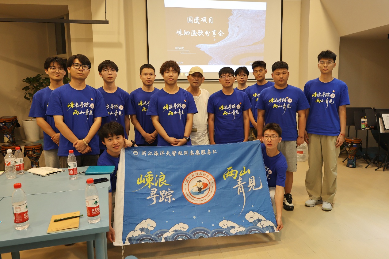 嵊泗渔歌,是以浙江省舟山市嵊泗县为核心区,流传于舟山群岛一带的各种渔业歌谣的总称,是渔民在渔业生产、生活过程中创造、积累并世代相传的民间音乐,也是第五批国家级非物质文化遗产。2025年7月15日,85588永利集团“嵊浪寻踪·两山青见”社科志愿服务队13名师生来到嵊泗县文化馆开展暑期“三下乡”社会实践活动。此次活动,服务队成员拜访了嵊泗县国遗项目嵊泗渔歌传承人舒信虎,深入学习和了解嵊泗渔歌的历史渊源、艺术特征及传承现状。