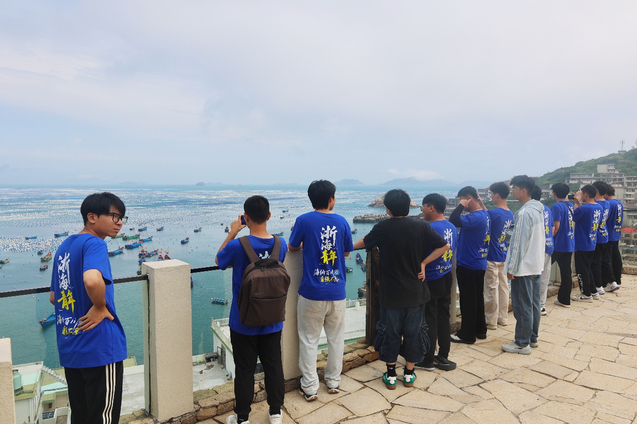服务队还赴嵊泗县博物馆、嵊泗县规划馆、嵊泗县海洋文化体验馆等地参观学习,深入了解了嵊泗列岛得天独厚的自然资源、别具一格的渔风民俗和源远流长的海岛历史。服务队还聆听了“两山理念·青年说”理论微党课全市巡回宣讲,《一颗贻贝看“两山”》《巍巍海上狼牙山》《耕海牧渔 踏浪前行》……一节节“接地气”“冒热气”“沾土气”的微型党课,提升了他们对“两山”理念的共鸣共识与情感认同。队员们还在嵊泗县国遗项目嵊泗渔歌传承人、五龙乡新的社会阶层人士舒信虎的带领下,学唱嵊泗渔歌。《带鱼煮冬菜》《东西南北风》《摇橹谣》……一首首旋律悠扬、饱含海味与乡愁的渔歌在耳畔回荡,让队员们在吟唱中感受到海岛人民的勤劳智慧与深厚情感,也激发了他们对海洋非遗保护和传承的思考与责任。