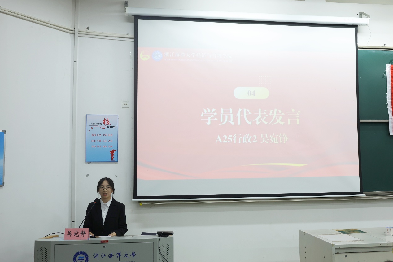 学员代表、来自A25行政2的吴宛铮同学饱含深情地回顾了共青团的百年光辉奋斗历程,表达了新时代青年对团组织的深厚情感与崇高敬意。她号召全体学员以此次入团积极分子培训班为契机,坚定理想信念,锤炼政治品格,在学习中汲取力量,在实践中勇于担当,以青春之我、奋斗之我,为实现中华民族伟大复兴贡献蓬勃力量。