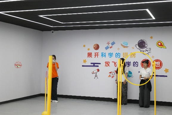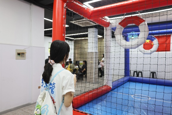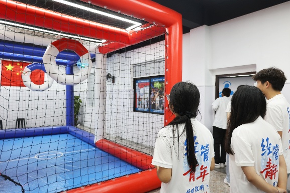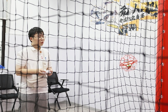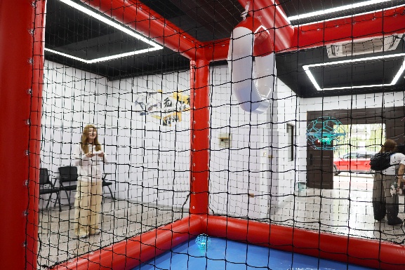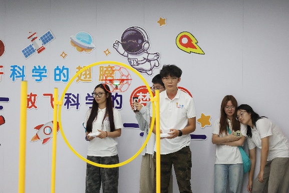 在FPV障碍赛中,学员们认真操控无人机穿越关卡,从绕杆、穿环到低空钻过模拟隧道,每一个关卡都需要精准操控遥感,既要控制飞行速度,又要预判转弯角度。无人机足球环节更是将科技与团队协作紧密结合。在防护场地内,学员们分成两队,操控包裹着柔软防撞材质的无人机,全力将特制轻质足球撞入对方球门。赛场上,无人机时而俯冲进攻、时而灵活防守,学员们通过默契配合调整战术,在紧张欢乐的对抗中,不仅提升了无人机操控技巧,更深刻理解了“团队协作”的科技实践意义。