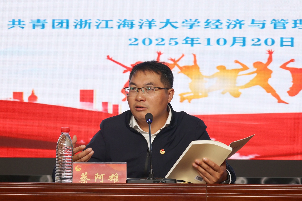 蔡阿雄书记指出,“青马工程”具有系统完善的培养体系,在学员学习与生活方面实行严格管理,并通过多环节综合评价全面考察学员表现。他鼓励学员采用科学高效的学习方法,真正做到学有所思、学有所获、学有所成。为此,他向全体学员提出三点殷切期望:一是要传承和弘扬红色精神,锤炼调查研究能力,在实践中砥砺品格、勇担重任;二是要锤炼忠诚的政治品格、浓厚的家国情怀和扎实的理论功底;三是要发扬实干精神,在本职岗位上勤学善干、知行合一。最后,蔡书记勉励全体学员为自己的人生负责,在专业学习和工作实践中不断取得优异成绩,不辜负组织的信任与期望。