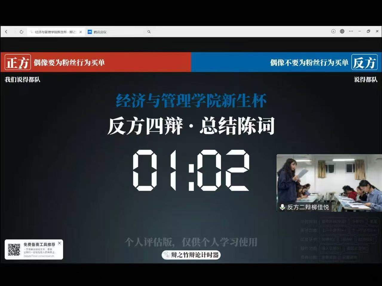 日程的繁忙阻挡不了辩论的热情,线上辩论赛如期举行。正方指出,粉丝与偶像属于利益共同体,偶像是粉丝行为的最大受益者,当粉丝做出不良行为时,偶像承担起相应的引导道义责任,这样能够避免事态恶化,营造良好的社会环境。对此,反方主张偶像对于超出可承担范围内,违反法律法规相关行为无需负责,粉丝的不当行为由资本逐利和饭圈乱象所致,属于粉丝作为独立行为能力的各体的自发行为,由偶像买单反而会掩盖乱象的本质,让粉丝丧失责任感。