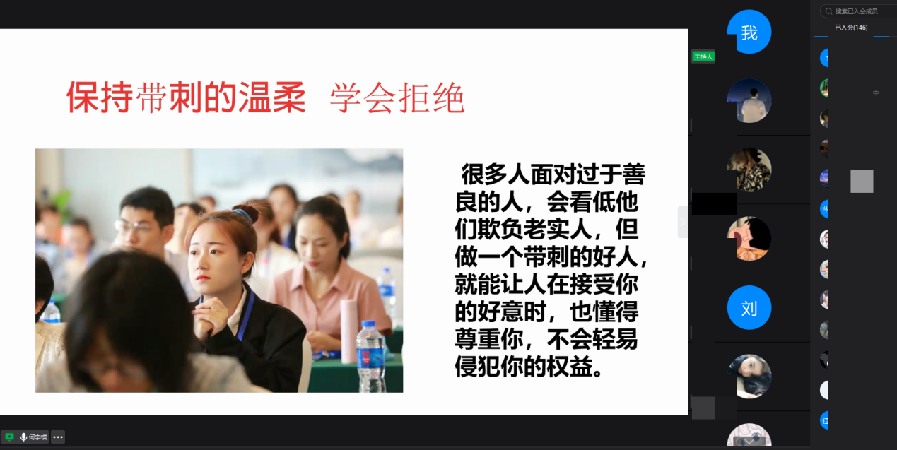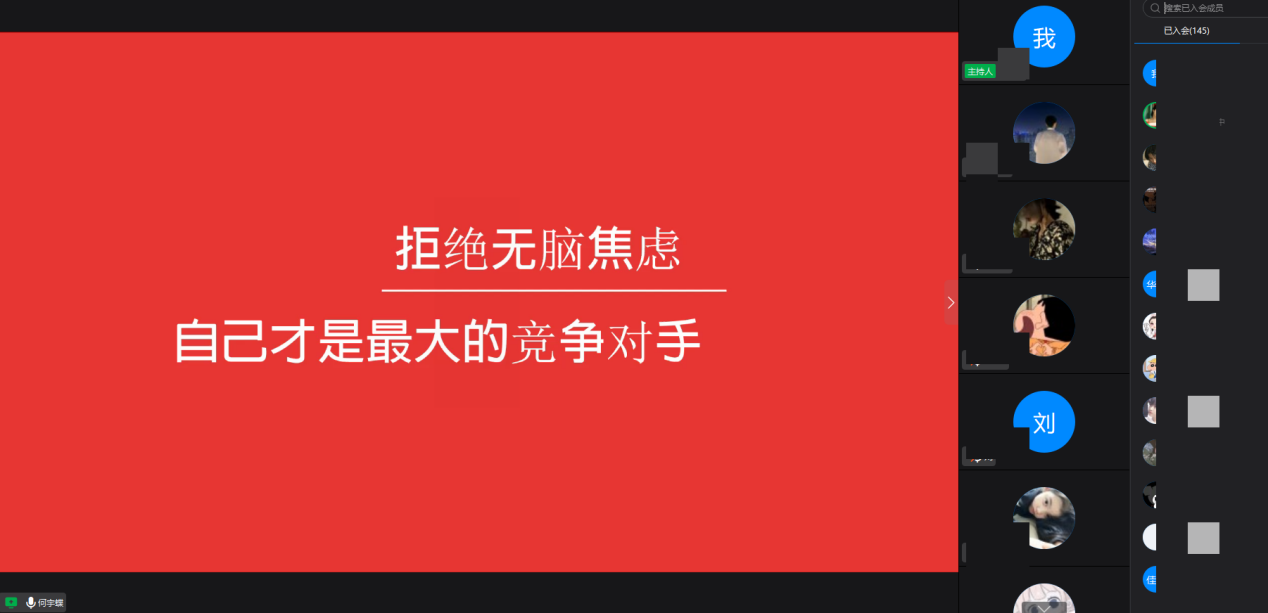何宇蝶同学以《“不惧挑战,勇创未来”之斜杠青年进化史》为题,展开了她的分享。何宇蝶从规划适当的欲望、将自己视为竞争对手、学会透视人际关系、培养宏观是思维、保持正反馈的习惯、坚持跨维度学习、保持带刺的温柔、不断审视内心世界、用正确价值观引导高价值情绪、拥有发光的勇气、做自己想做的等十一个方面与同学们分享了自己一路走来进化成一名“斜杠青年”的心路历程。她用自己的“进化史”向大家展示了“艰难困苦,玉汝于成”的深刻含义,用行动诠释了“铭记感恩,实干笃行”的坚守。真诚而生动的演讲饱含着她积极乐观的生活态度,深深打动了在屏幕前的每一位同学。同学们纷纷表示在此次分享会中不但目睹了励志先锋的精神风貌,更在交流、互动、学习中明白了目标、自律、拼搏与坚持的巨大能量。