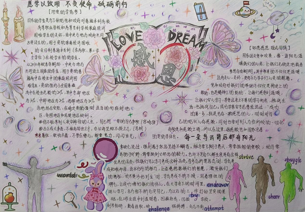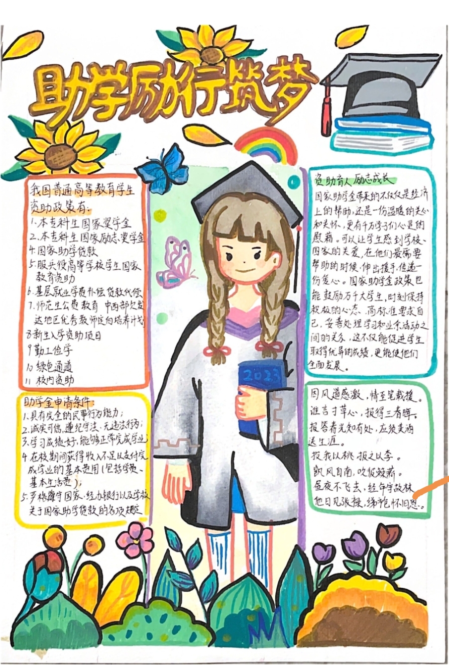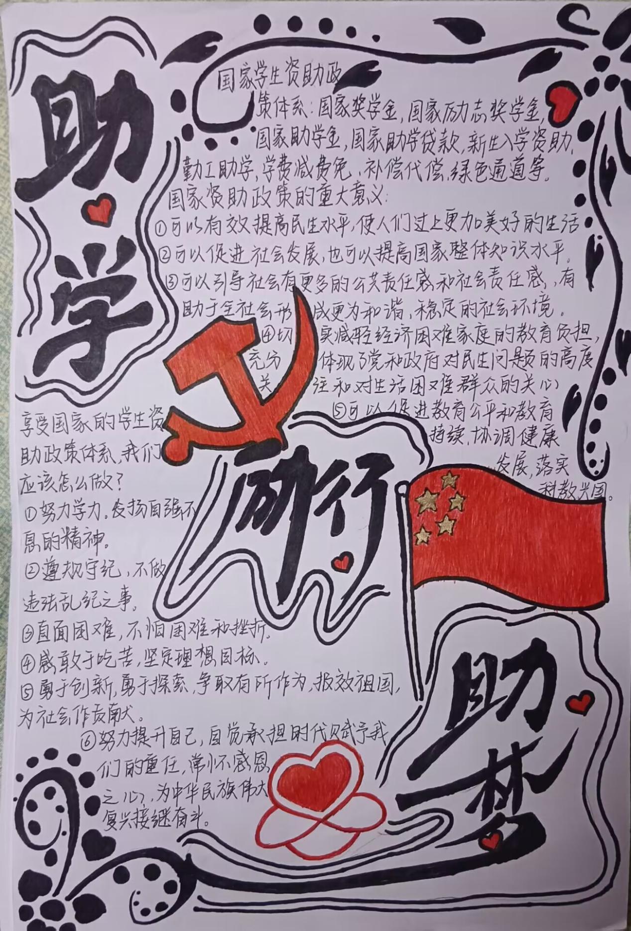 为了进一步落实国家对高校家庭经济困难学生的各项资助政策,增强学生对资助政策的理解,提高对资助工作的知晓率,着实有效地通过奖、助、勤、补等多种形式开展资助工作。2023年3月19日-4月18日期间,yl88858永利集团开展了以“助学 励行 筑梦”为主题的资助政策宣传手抄报征集活动。