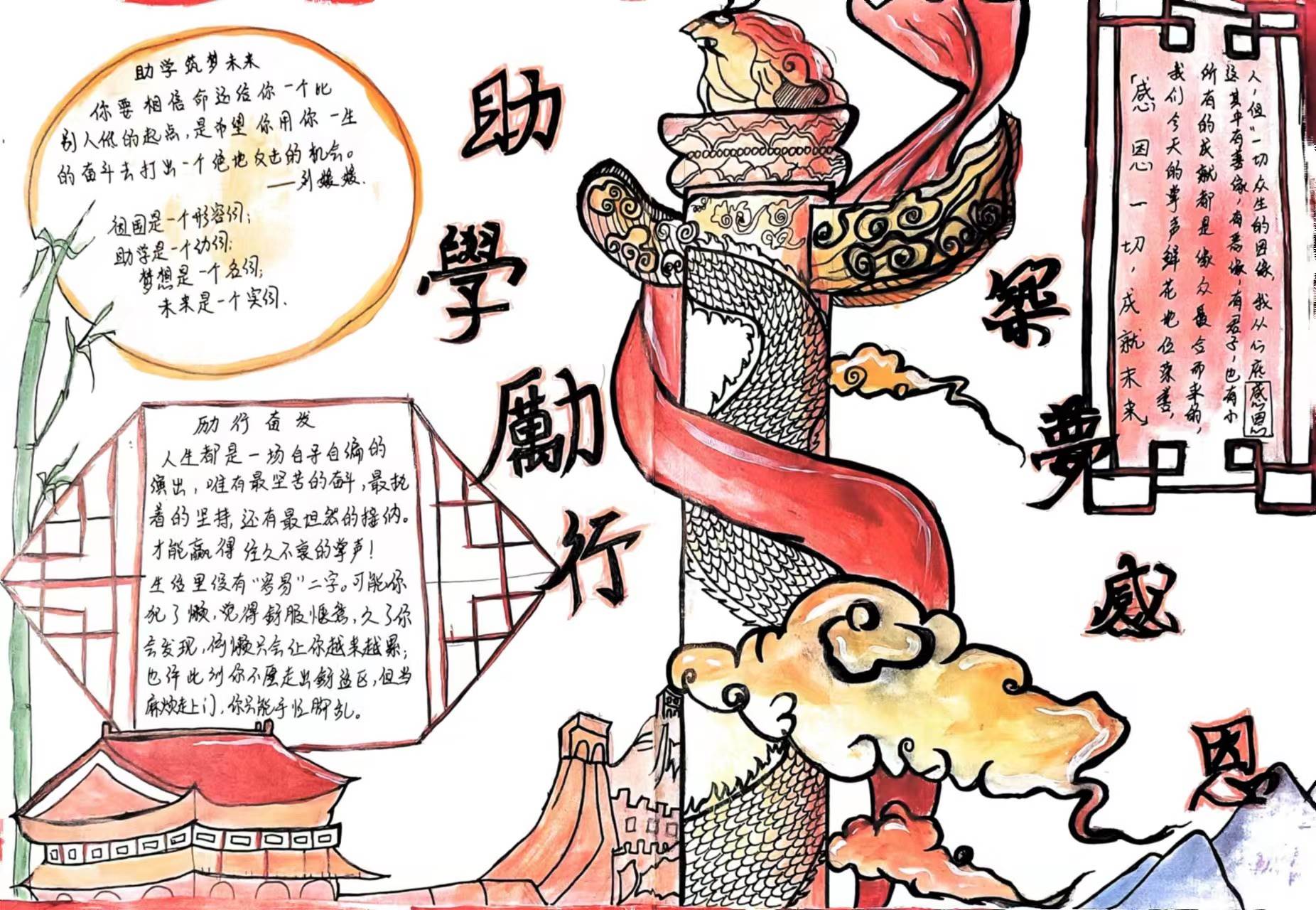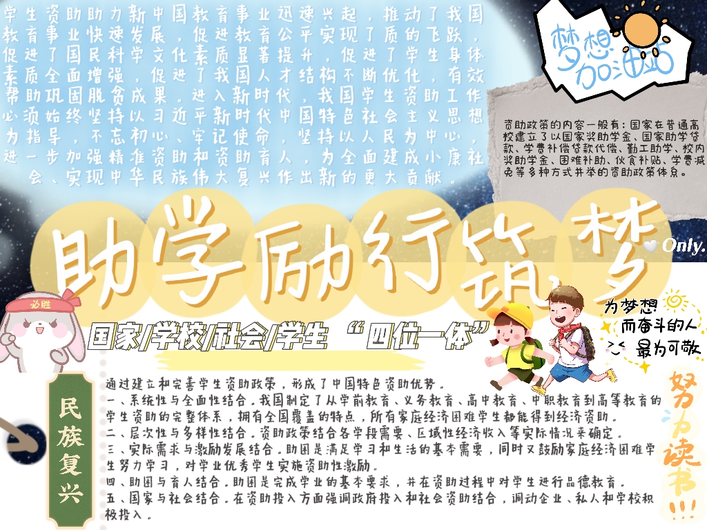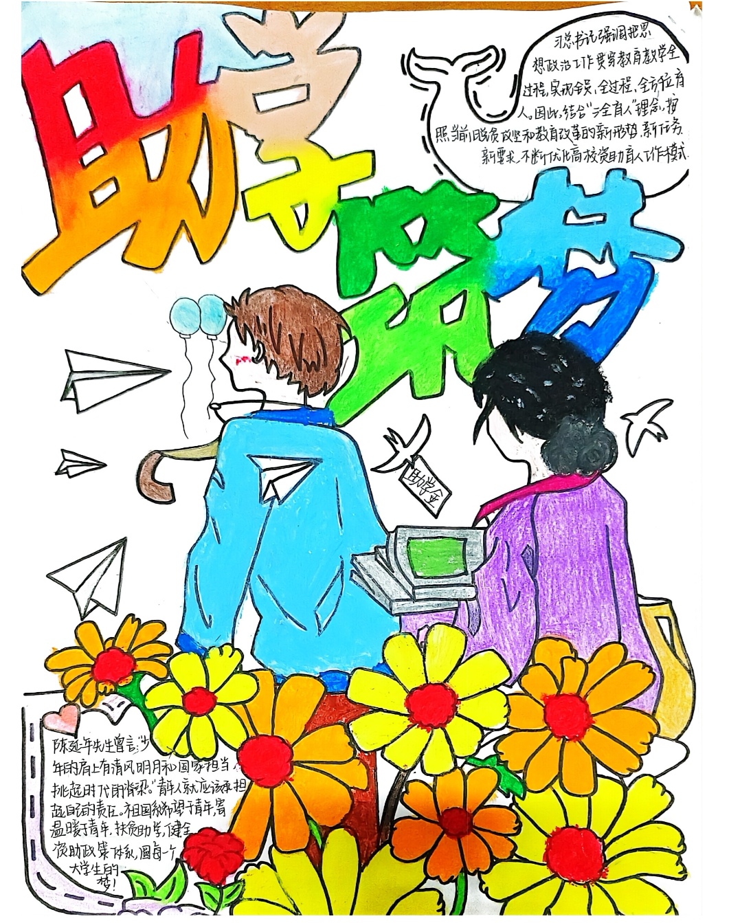 为了进一步落实国家对高校家庭经济困难学生的各项资助政策,增强学生对资助政策的理解,提高对资助工作的知晓率,着实有效地通过奖、助、勤、补等多种形式开展资助工作。2023年3月19日-4月18日期间,yl88858永利集团开展了以“助学 励行 筑梦”为主题的资助政策宣传手抄报征集活动。