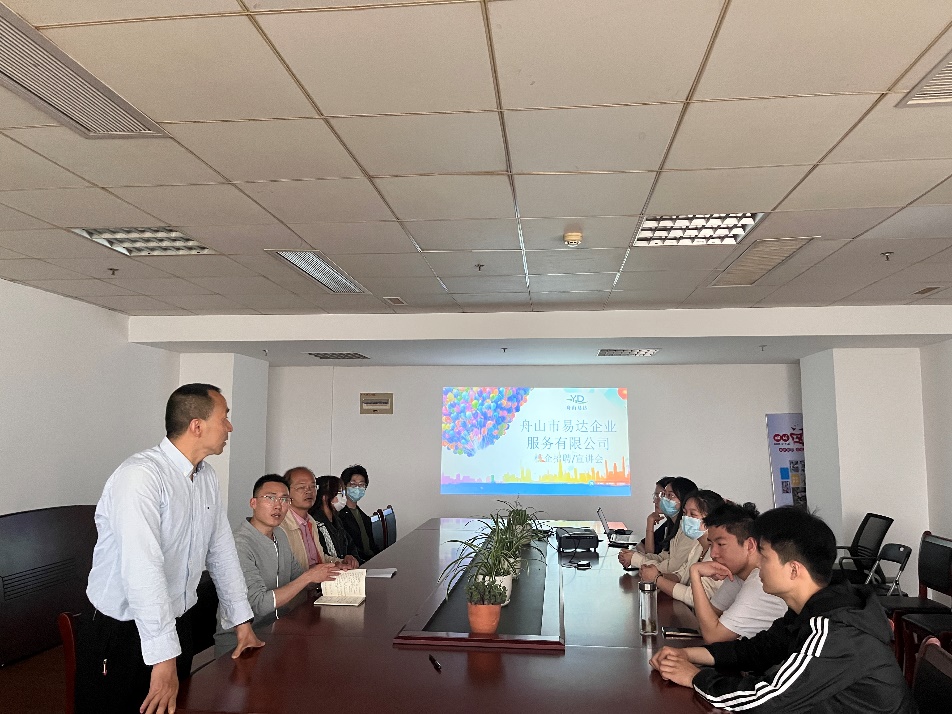 参访活动中,舟山市易达企业服务有限公司人事经理方芳为海大学子介绍了公司主营项目、目前业务情况、人才发展通道以及岗位需求等。随后,易达企业服务有限公司总经理吴友军结合自身经历为海大学子热情解答了岗位内容、职业内涵等相关的问题。通过介绍,帮助学子们对易达企业服务有限公司有了初步的认识。