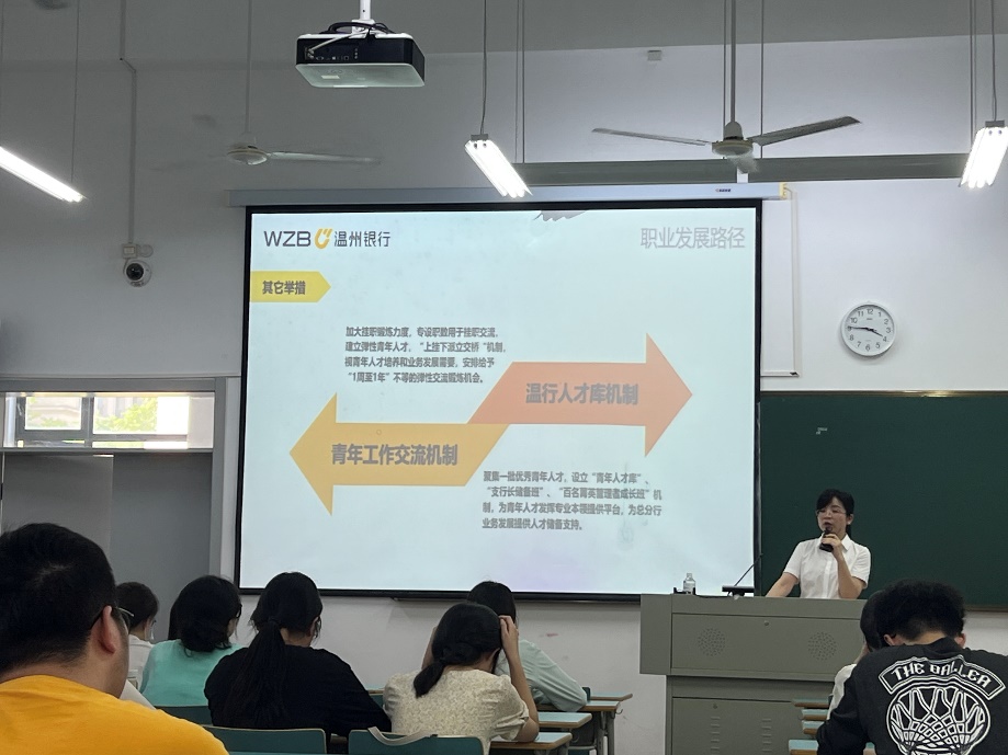 陈红玉老师从温州银行简介出发,让同学们对温州银行有了初步的了解。随后介绍了岗位培训机制中的总行管理培训生和金融科技培训生,并且可以双向选择。然后是职业发展选择的两通道:管理通道与专业通道,助力人才的领导力和专业能力的成长;三序列:市场营销、职能管理和柜面服务。陈老师还对员工入职培训计划、招聘岗位和薪酬福利待遇进行了一一解答。温州银行通过设立青年工作交流机制和温行人才库机制,加大锻炼的力度,建立弹性青年人才,为年轻人发挥专业本领提供舞台,为银行的业务发展提供人才储备支持。