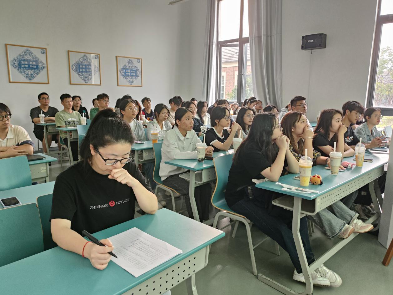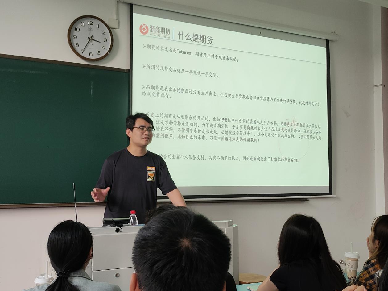 金辉老师从期货的定义、特点、研究立足点、功能发挥、交易的特点与风险、实体经济服务以及研究方向等方面为同学们深入讲解了浙商期货的基本情况及其优势。宣讲会中,金老师以期货的专业知识为切入,以青山镍事件为例,指明该时间伴随的形容词经常是“史诗级逼空”“教科书级反杀”等一系列不明觉厉的词,从而引申到期货产业链涉及的多个环节、期货交易的多个环节,指出每个环节出现问题都会引起价格的波动,在带来交易机会的同时也会带来风险。金老师用通俗易懂的案例为学生传授专业知识,让我院学生更加了解期货。