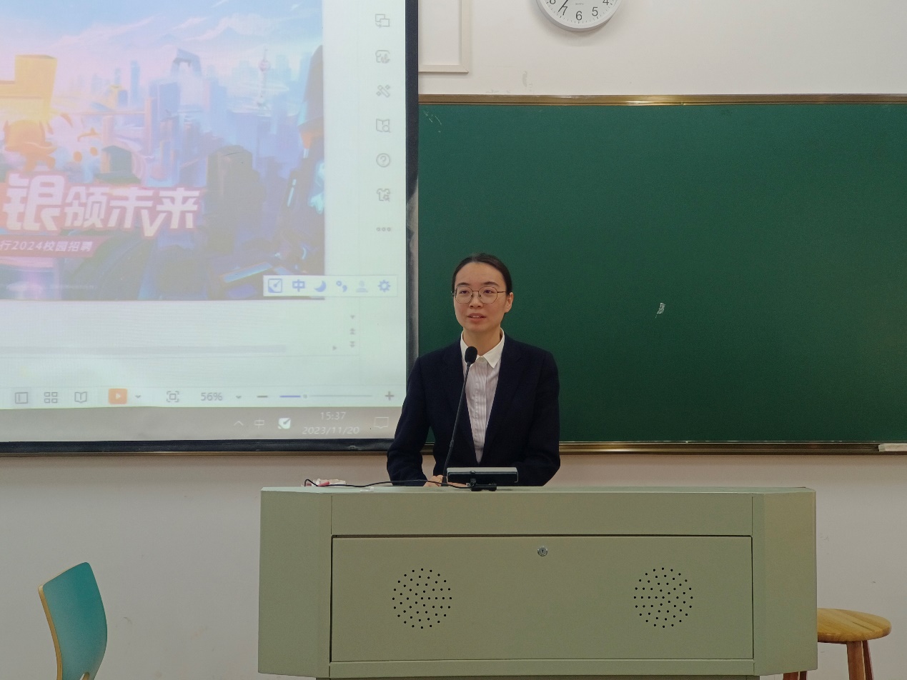 宣讲会主要通过宁波银行的介绍、就业人才发展方向、现场投递简历面试这三个部分进行开展,章学姐从宁波银行的发展历史、银行文化、银行招聘岗位要求、上岗待遇等方面内容进行了介绍,重点介绍了同学们关心的岗位要求、薪资待遇的构成、福利的具体细节以及员工职业发展通道与前景情况。章学姐表示如今银行已经从1.0时代进入2.0时代,宁波银行还开通了很多线上的服务,对可能存在的淘汰现象做了全方位的改革,她也分享了自己毕业后选择来到宁波银行工作的亲身经历,强调了第一份工作的重要性,同时她建议同学们在初次求职时应该找有挑战性的工作,勇于挑战勇于追求。