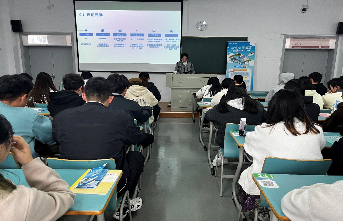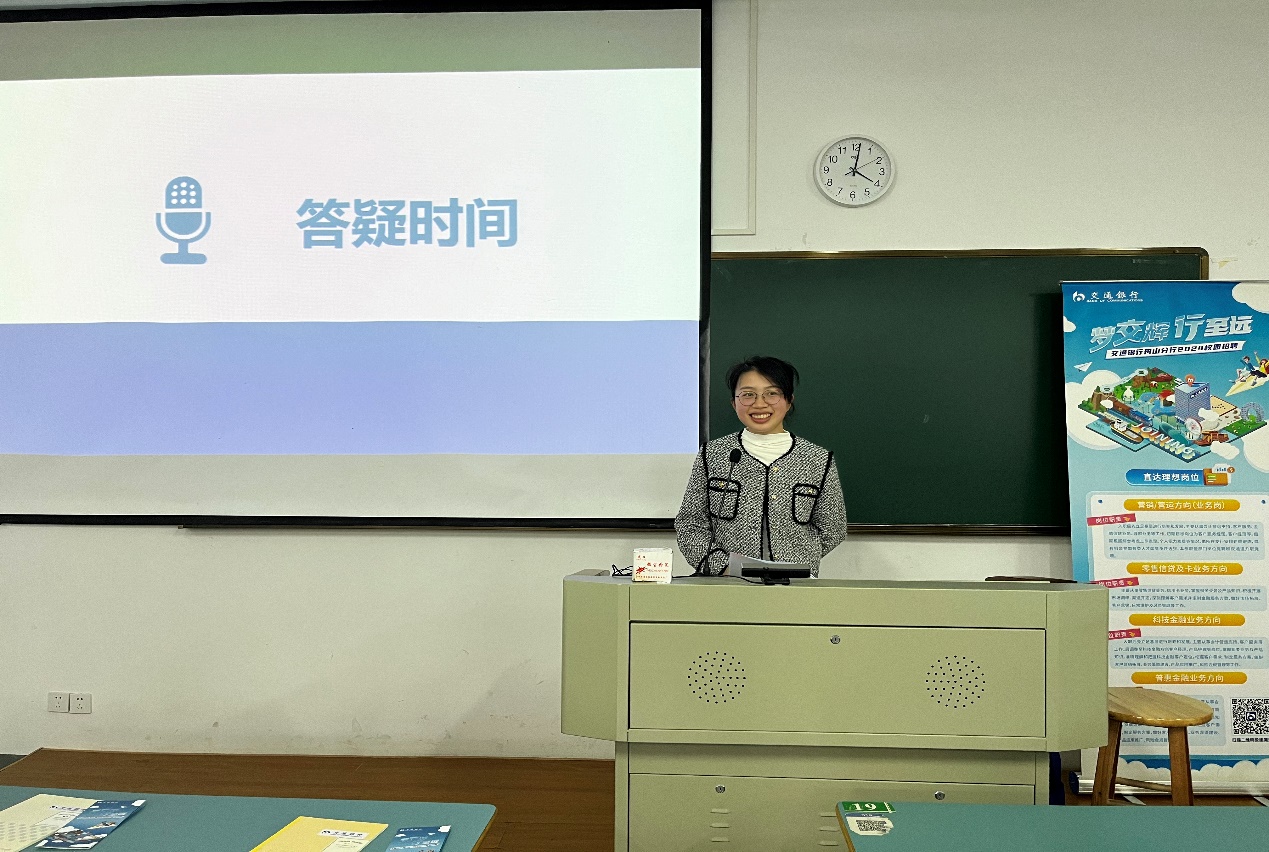 负责人滕佳璐老师详细介绍了交通银行的企业历史、员工福利、培训机制、实习机会及晋升路径等,全方位地为同学们展示了银行的基本情况及其独特优势。副行长丁盛波老师也对银行的营销及管理岗位进行了深入讲解,特别是从员工的薪酬待遇和职业发展两大角度出发,强调了交通银行舟山分行在校园招聘中的竞争力。宣讲会结束后,滕老师和丁老师对学生们关心的绩效考核、企业文化、职业前景等问题进行了耐心的答疑,让学生们对未来的职业生涯有了更为明确的规划。