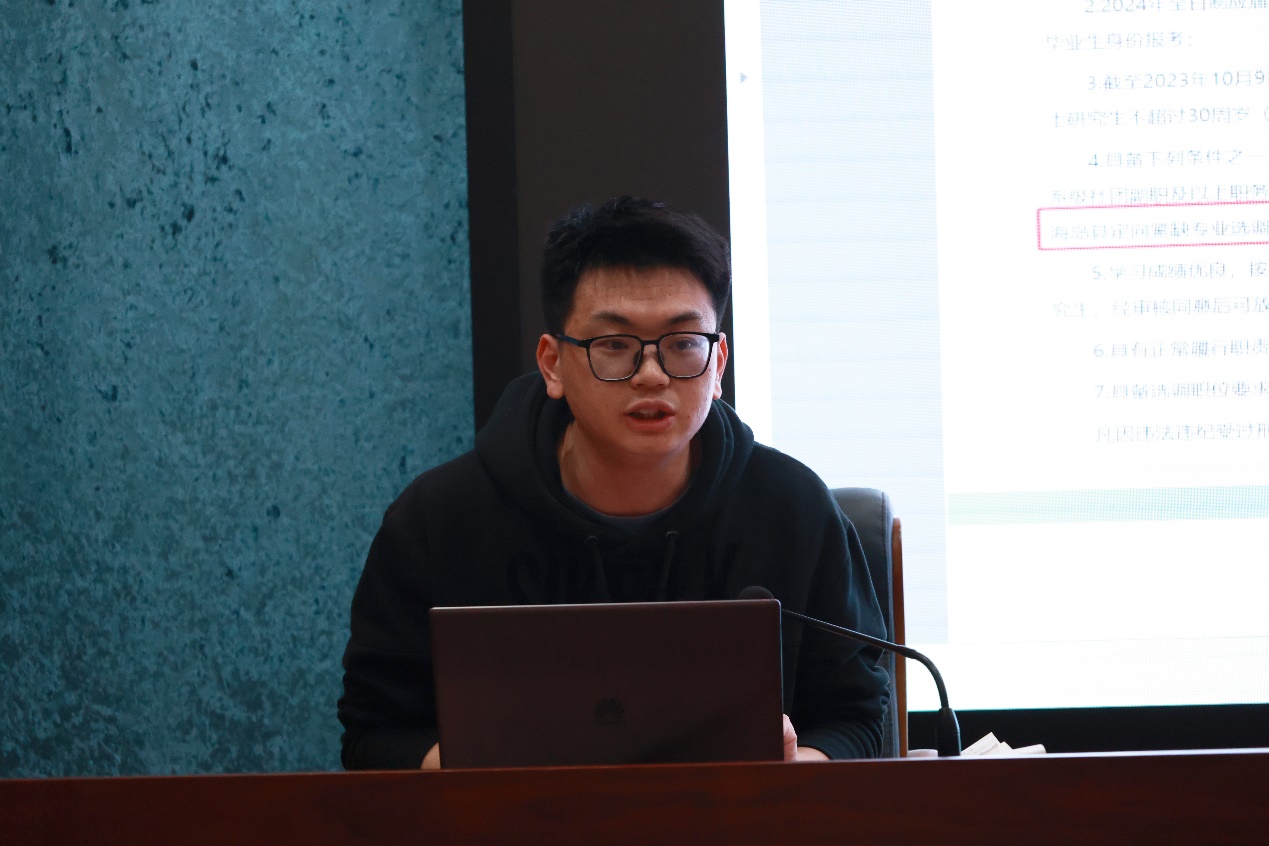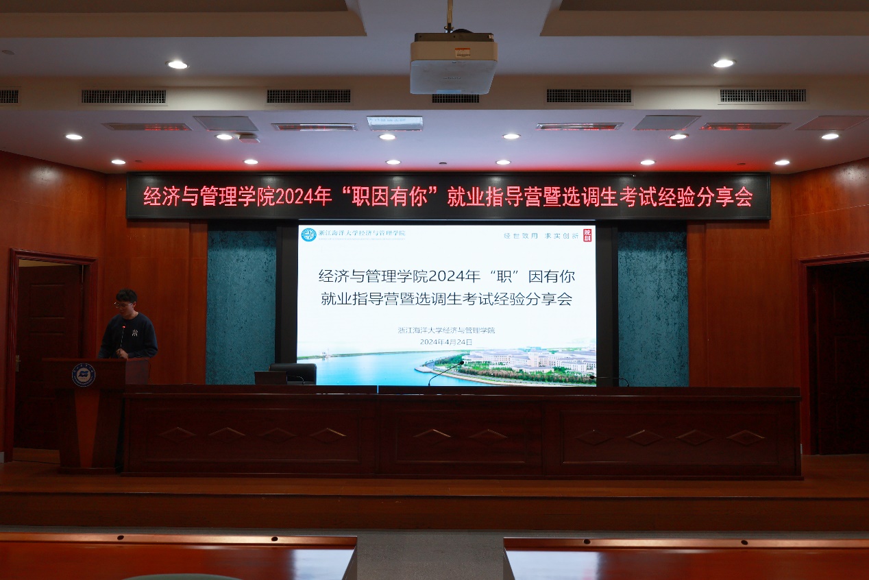 为扎实推进共青团促就业行动,帮助我院2025届学生顺利备战选调生考试,学习选调生备考经验,鼓励经管学子毕业后深入基层、扎根乡土、筑梦未来,2024年4月24日下午,yl88858永利集团于图书馆一楼报告厅顺利举办2024年“职因有你”就业指导营暨选调生考试经验分享会。本次讲座由就业辅导员李金航主持,讲座邀请到三位上岸2023年度浙江省党政机关选调生的同学,分别是Y22旅游高彬哲、杨择昀同学和A20财务2张诗雨同学,由他们为同学们全方位解读选调生考试的考情和自身的备考经验,帮助同学们筑梦成“公”。