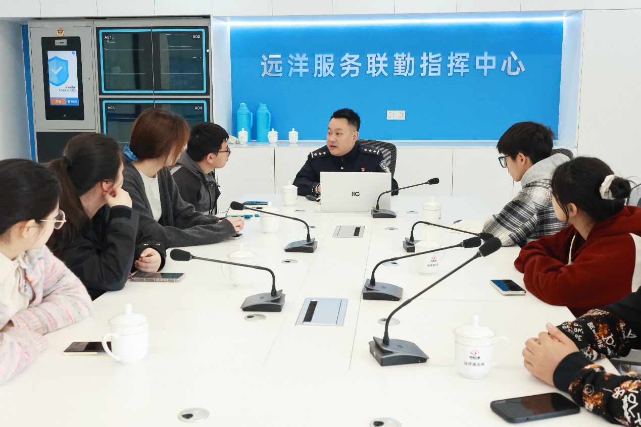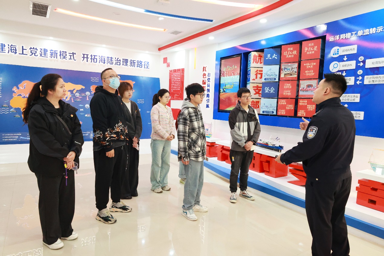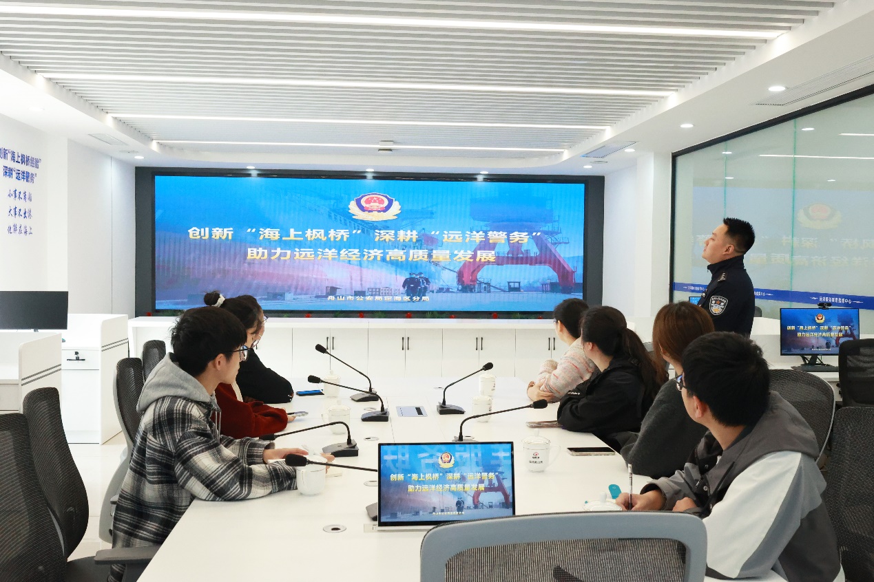 4月27日,yl88858永利集团团委负责人施辰阳再次带队前往基地,调研学习由舟山市独特的地理区位、深厚的海洋文化孕育滋养的海味十足的社会治安综合治理特色品牌——“海上枫桥经验”。基地派出所民警潘绍灿以《创新“海上枫桥”,深耕“远洋警务”,助力远洋经济高质量发展》为题,为全体师生深入介绍了当地公安机关立足发展海洋经济、建设海洋强国的战略高度,建立“海上老娘舅”队伍,打造“红帆示范”先锋船,开展海上纠纷化解、安全联防、抢险互助等经验做法。