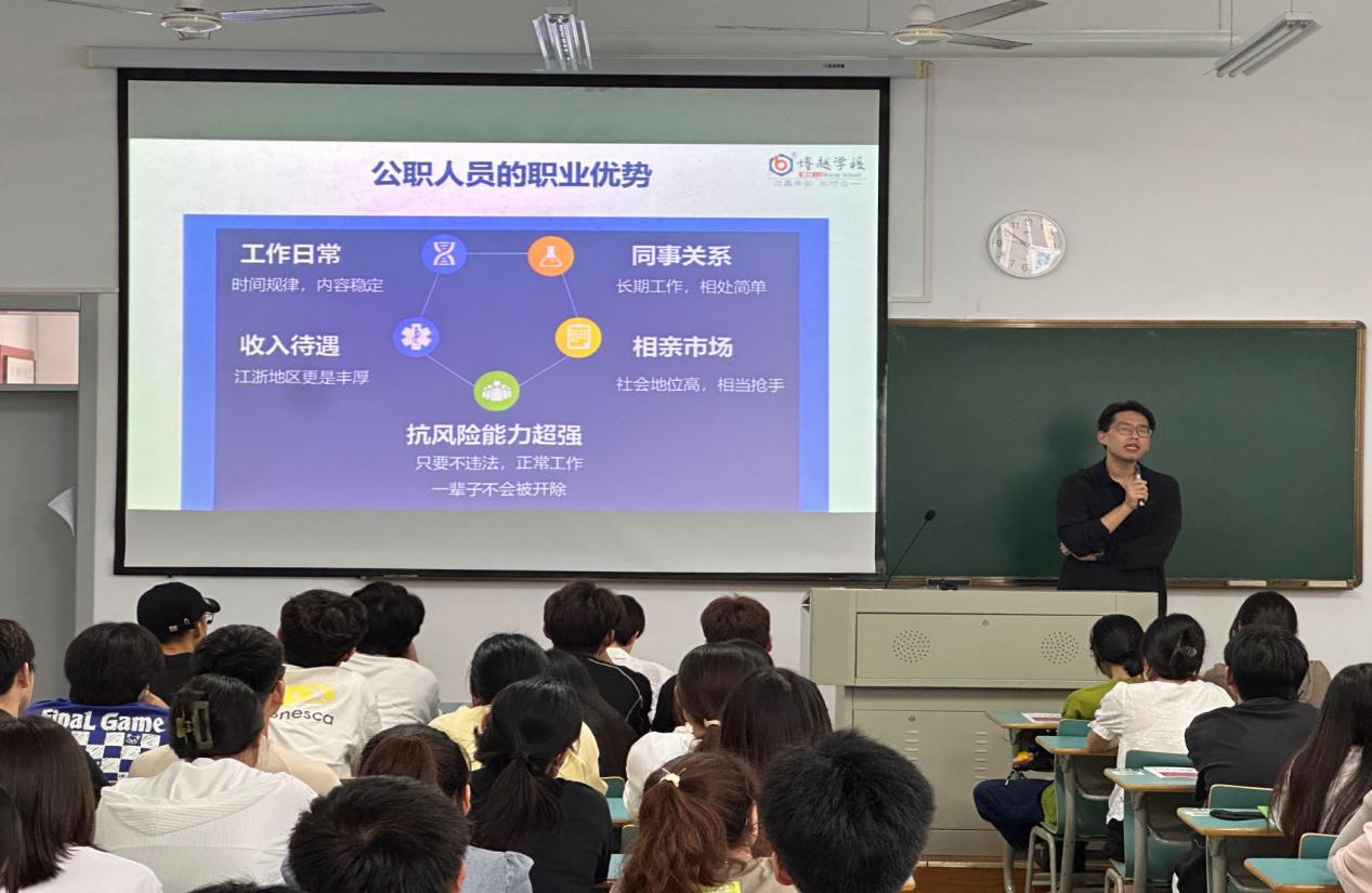 鲁邓燕老师为同学们分析了当前的就业形势和政策,结合行测的逻辑推理到申论的写作精髓,对公考的相关内容进行了全面介绍和分析。她详细讲解了公务员考试的分类、报名程序及资格、竞争及录取率,以及公务员职业的优势等。随后,赵鹏飞老师为同学们介绍了公考的详细流程。他从公务员的职业优势、当今社会的就业形势、智能化的背景等方面剖析了选择公考的理由,帮助同学们分析了各类考试的优势和特点,强调要把握好考公考编的时间线,做好时间和精力分配,抓住每次报考机会。赵老师还重点讲解了应届生报考公务员的优势,提醒同学们在报考时要充分了解各项政策,确保自己的条件符合要求,避免错失考试机会。