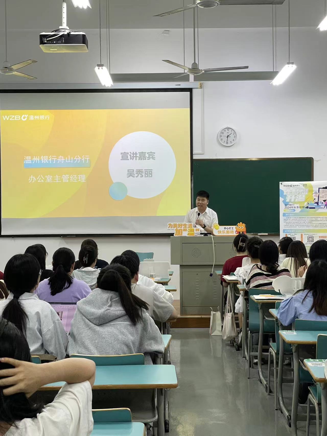 为扎实推进共青团促进大学生就业行动,使我院学生广泛了解行业动态,提升其就业竞争力,2024年9月27日下午,yl88858永利集团在新城校区新教学楼B103顺利举办温州银行舟山分行校园宣讲会。学院共120余名大三、大四学生参加,此次宣讲会由温州银行舟山分行办公室主管经理吴秀丽主持。