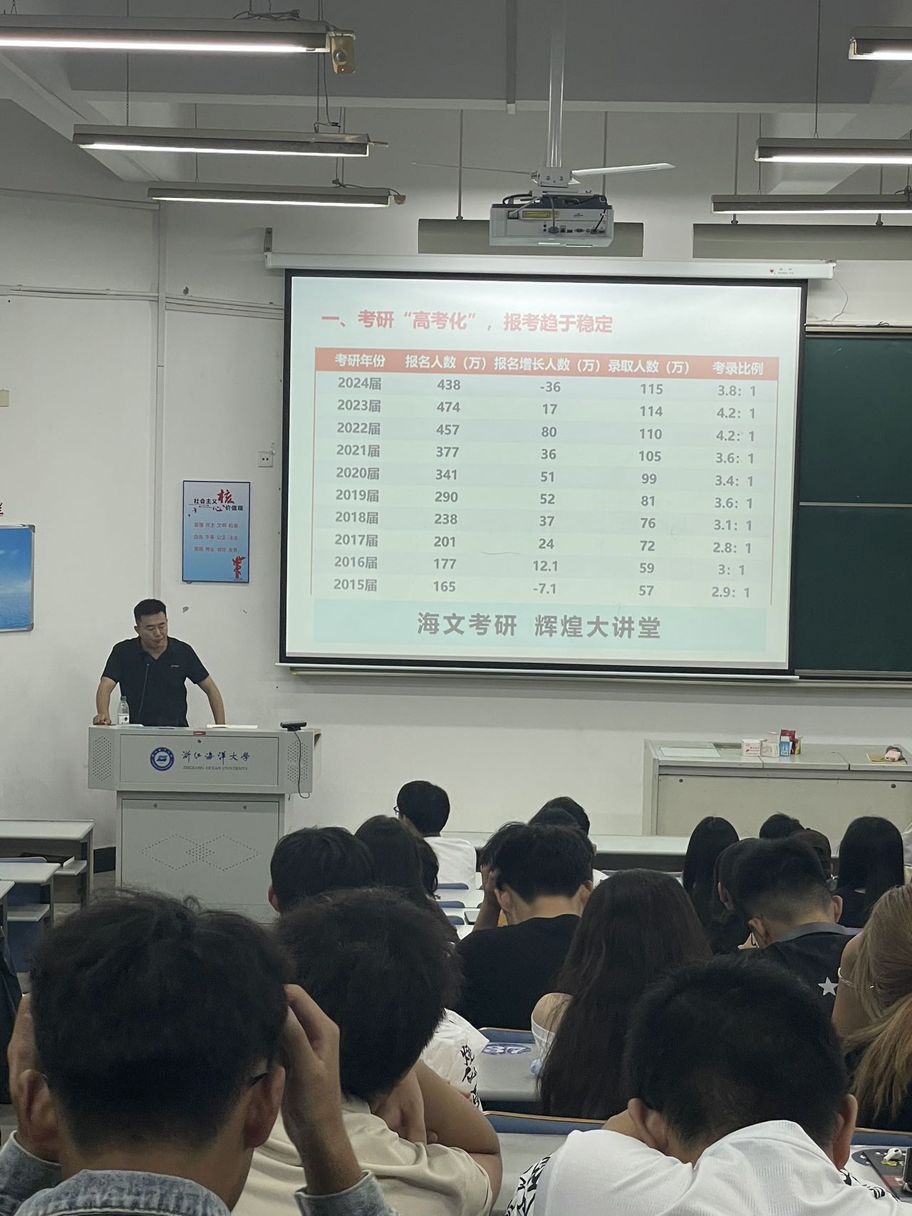 陈老师列举了历年考研上岸的学长学姐的各种心得,指出当代大学生对于考研、考公与出国留学的态度,对于三种选择的学生就业情况进行了深入分析,并作出个人建议。随后,陈老师围绕“2024年考研趋势、院校专业选择、初试考什么”三个方面展开讲座。他着重分析了今年考研的最新趋势,对于经管类学生考研专业选择,提出了“先定专业,再定地区,后定学校”的方法。陈老师还为同学们介绍了考研初试的基本流程、考试内容与注意事项,并提醒同学们在备考中的关键细节,鼓励他们提前规划、合理备考,以提高上岸的成功率。