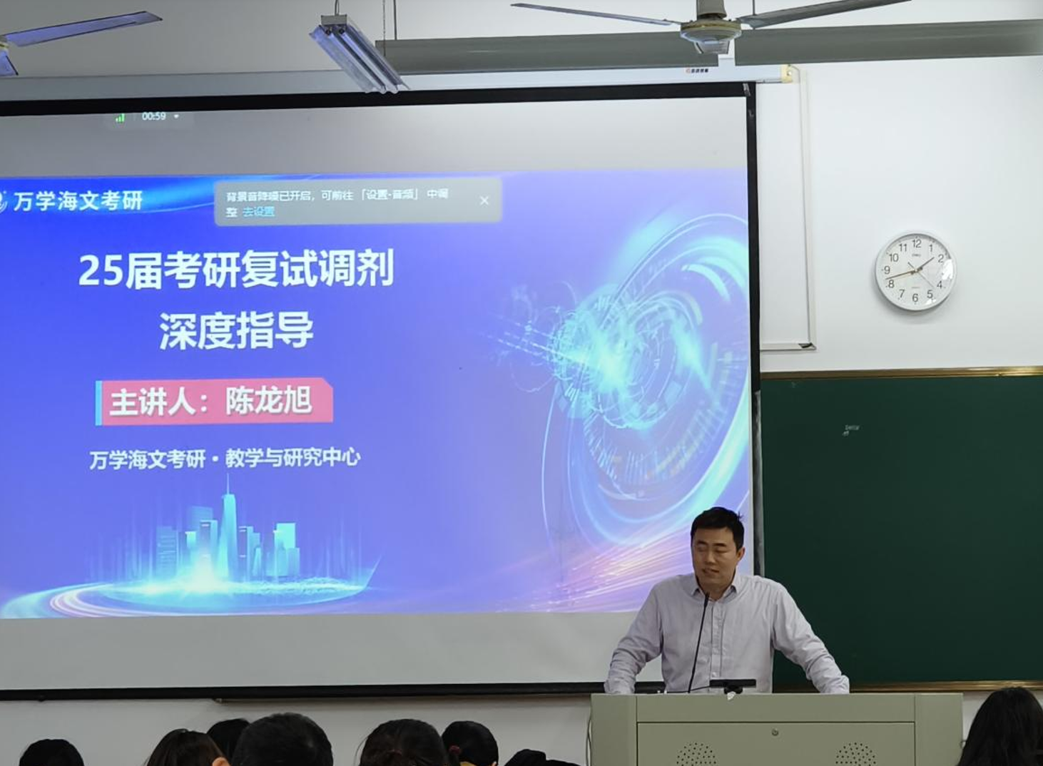 讲座伊始,陈龙旭老师凭借自身经验,结合当下考研形势,开展考研复试流程讲解、复试技巧与心态调整讲座。陈老师首先对复试流程进行讲解,从材料审核的注意要点到笔试、面试的流程,各环节一一阐述,让同学们对复试流程有了清晰的认知。其中,陈老师强调了知识储备是关键,提醒同学们要巩固专业知识并且拓展自己的知识面,答题时要有逻辑,思路清晰,突出重点。在面试礼仪上,陈老师强调了着装得体、礼貌用语、行为礼仪的重要性,遇到难题不要慌张,沉着冷静,切忌不懂装懂。面对复试压力,陈老师指出心态调整至关重要,克服焦虑情绪,按计划复习,不盲目与他人比较。最后,陈老师建议同学们要提前做好准备,以积极的态度应对复试,相信同学们一定可以取得让自己满意的成绩。