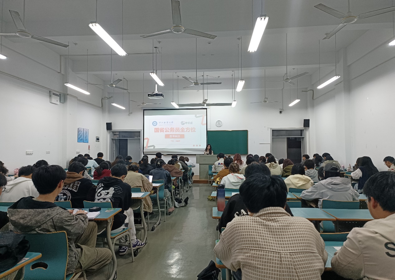 沈卢怡同学从自身备考历程出发,从学科知识体系构建、时间管理等角度,系统梳理了在校生考公复习的重点与难点,通过典型案例分析为同学们提供了清晰的备考思路。随后,她详细介绍了自身笔试138.6分的高分策略,围绕行测五大模块的答题技巧、申论写作的核心要点,分享了科学高效的学习方法与备考心得。在面试环节,沈卢怡以自身面试第一名的实战经验为例,从礼仪规范、临场应变、结构化面试应答等方面展开讲解,向同学们传授了切实可行的面试提升技巧。最后,沈卢怡学姐结合最新政策文件,解读了当前公职类考试的招录趋势、报考要求及考情变化,帮助同学们精准把握备考方向。她寄语全体备考学子,希望同学们能够锚定目标、科学备考,在考试中取得优异成绩,成功上岸,顺利实现职业理想。