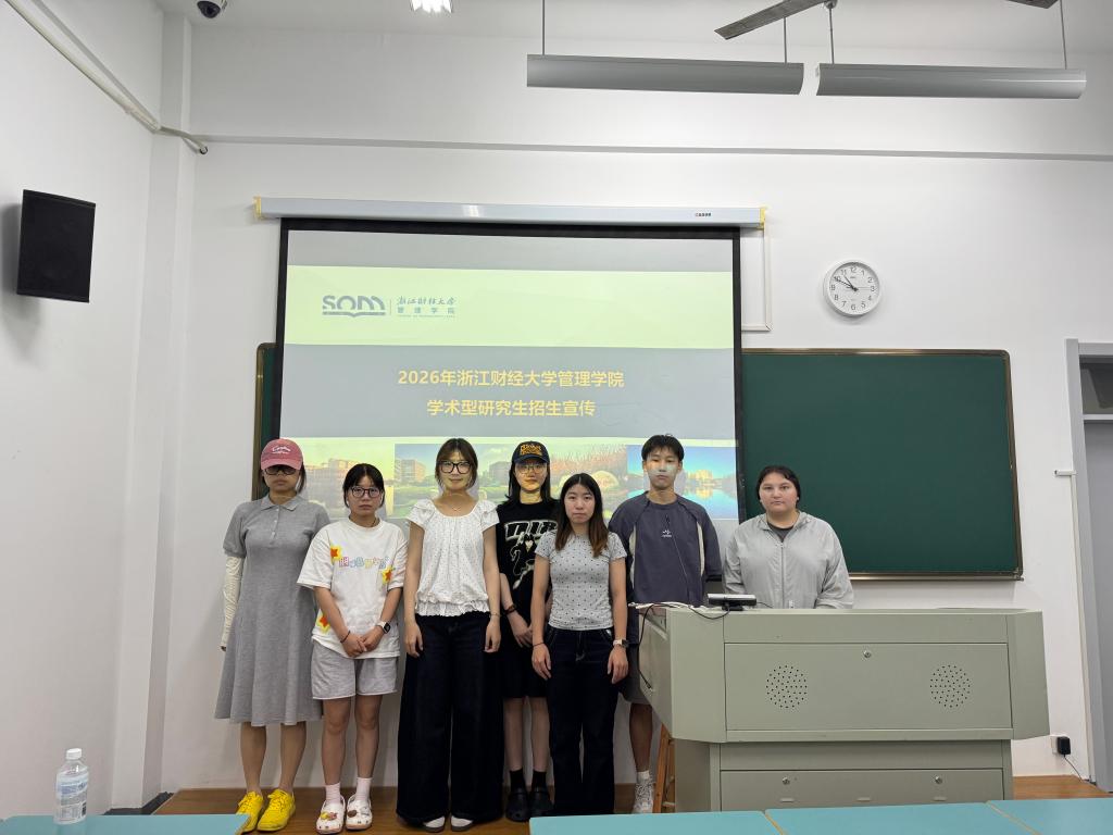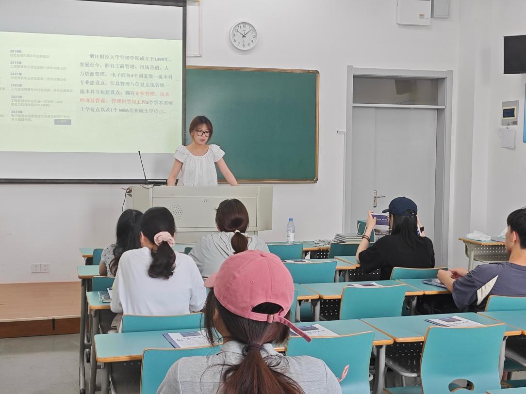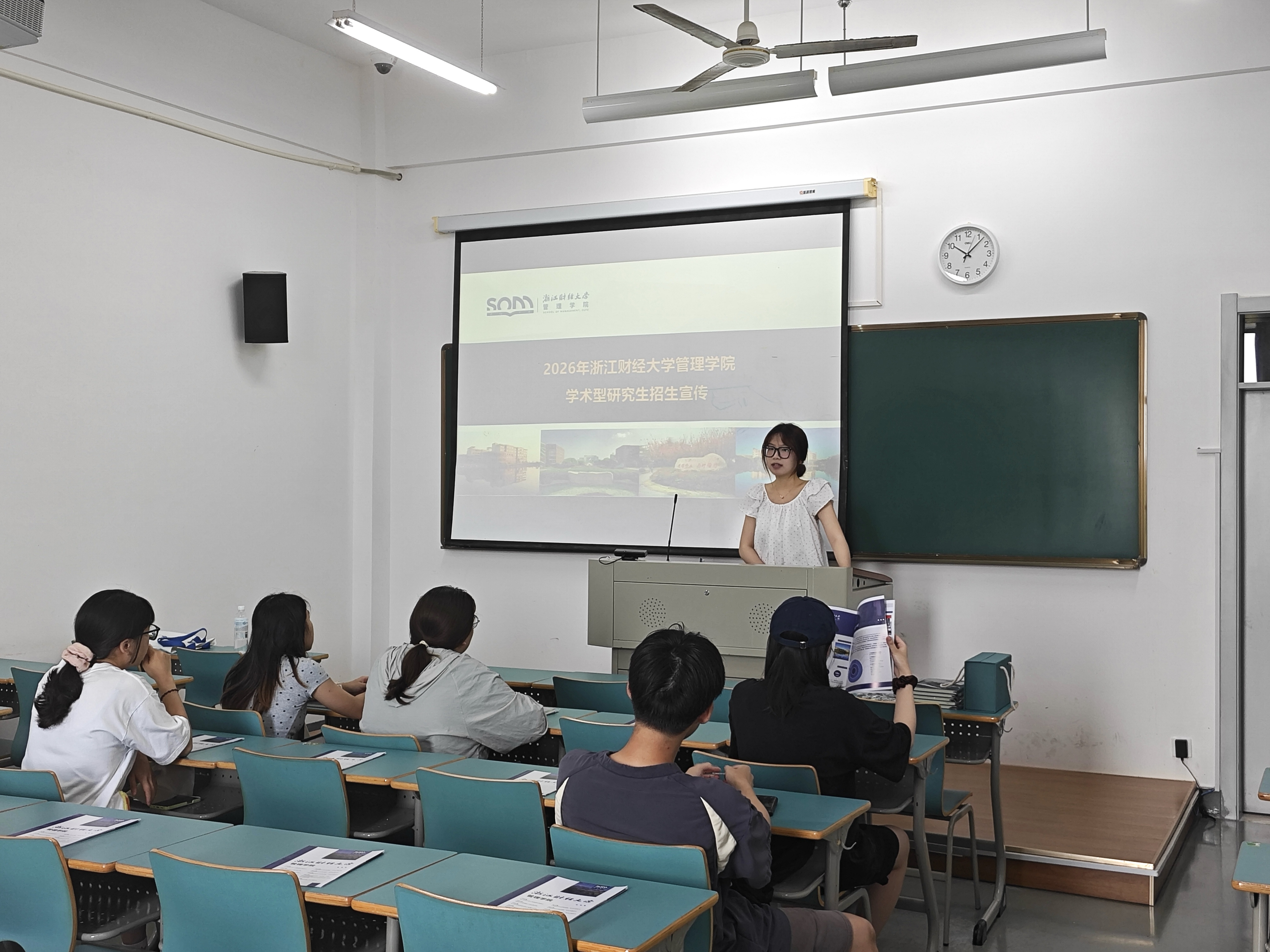 为加强升学指导服务、帮助有意向考研的同学全面了解目标院校及专业情况,2025年7月5日,yl88858永利集团于新城校区教学楼A307室开展2026年浙江财经大学管理学院学术型研究生招生宣传会。本次宣讲会由学院2023届毕业生、原A19经济2班学生、硕士就读于浙江财经大学管理学院的胡亚冰校友携手同校硕士研究生徐一格、张蓝予同学共同主讲。