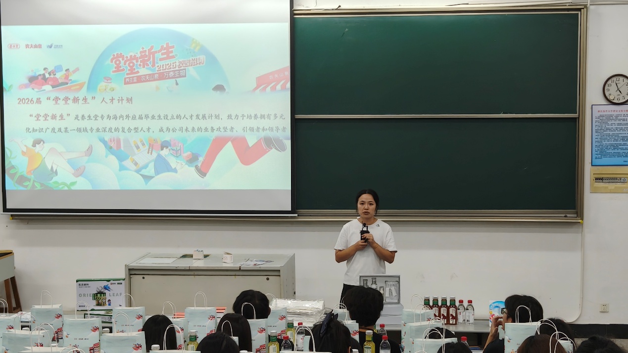 在校园招聘宣讲会上,养生堂公司刘佩经理围绕企业发展、招聘规划及求职建议作了详细介绍。刘经理系统讲解了养生堂集团的发展历程及当前建设布局,帮助同学们全面了解企业整体情况。他特别强调,第一份工作对个人职业生涯具有深远影响,择业时应注重“行业选择”,并提前做好职业规划。同时,他指出,依托公司强大的品牌影响力,员工能够获得长期的职业背书,充分展现出农夫山泉在校园招聘中的吸引力与竞争优势。