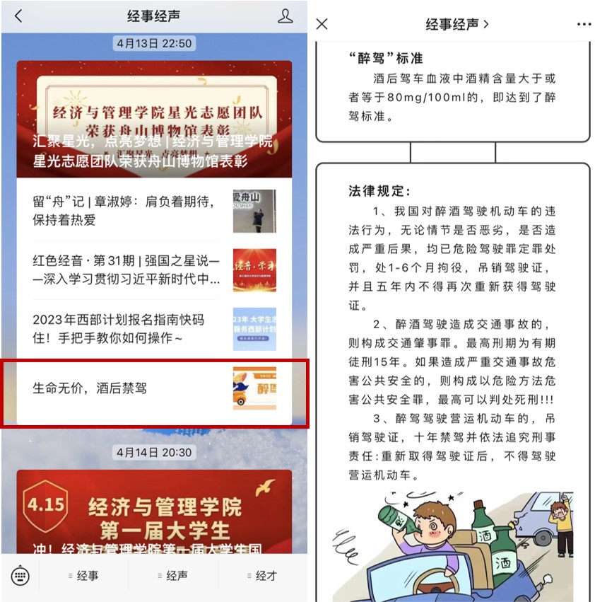 运用学院官方微信公众号“经事经声”平台,详细阐述酒驾醉驾的判定标准,宣传整治酒驾醉驾的必要性和急迫性,算清酒驾醉驾的惨重代价,引导我院教职员工严守党纪国法,紧绷纪律之弦,推动“喝酒不开车,开车不喝酒”的法律观念和安全意识入脑入心。
