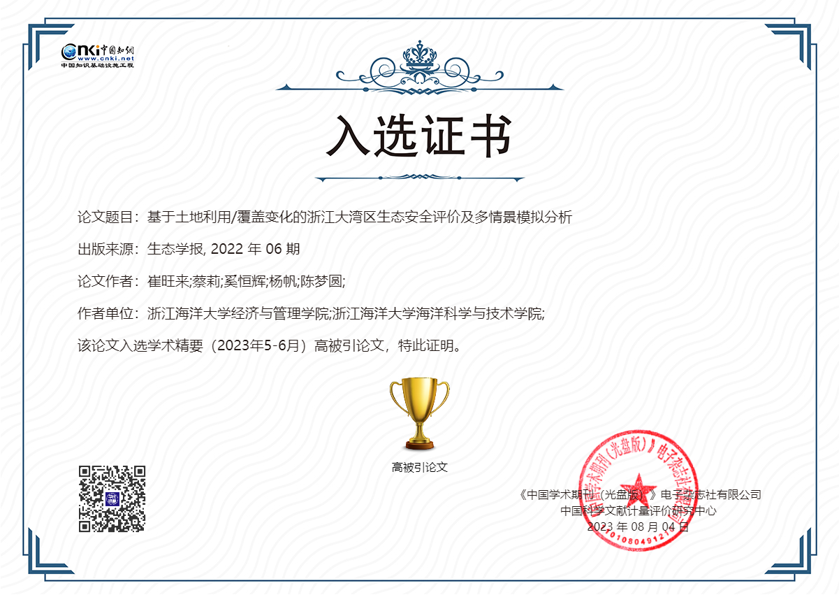 近日,中国知网评价中心《学术精要数据库》“高影响力论文”评选结果揭晓,经管学院崔旺来教授团队发表在《生态学报》2022年06期的研究论文“基于土地利用/覆盖变化的浙江大湾区生态安全评价及多情景模拟分析”,入选学术精要(2023年5-6月)高被引论文。