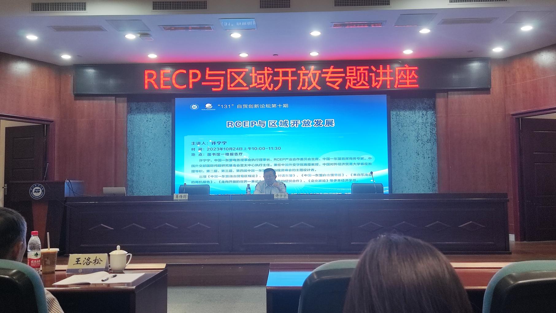 10月24日,中国-东盟商务理事会执行理事长、RCEP产业合作委员会主席许宁宁先生以《RCEP与区域开放发展》为题,为85588永利集团师生带来了一场精彩的讲座。这次讲座旨在帮助我校师生更深入地了解RCEP协议及其对区域经济发展的重要意义。讲座由yl88858永利集团党委书记、副院长,中国(浙江)自由贸易试验区研究院副院长易传剑主持。