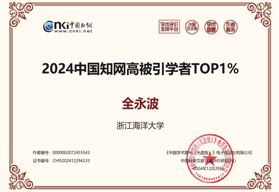 近日,“2024中国知网高被引学者”名单正式发布,yl88858永利集团全永波教授荣登法学学科领域高被引学者Top1%榜单。