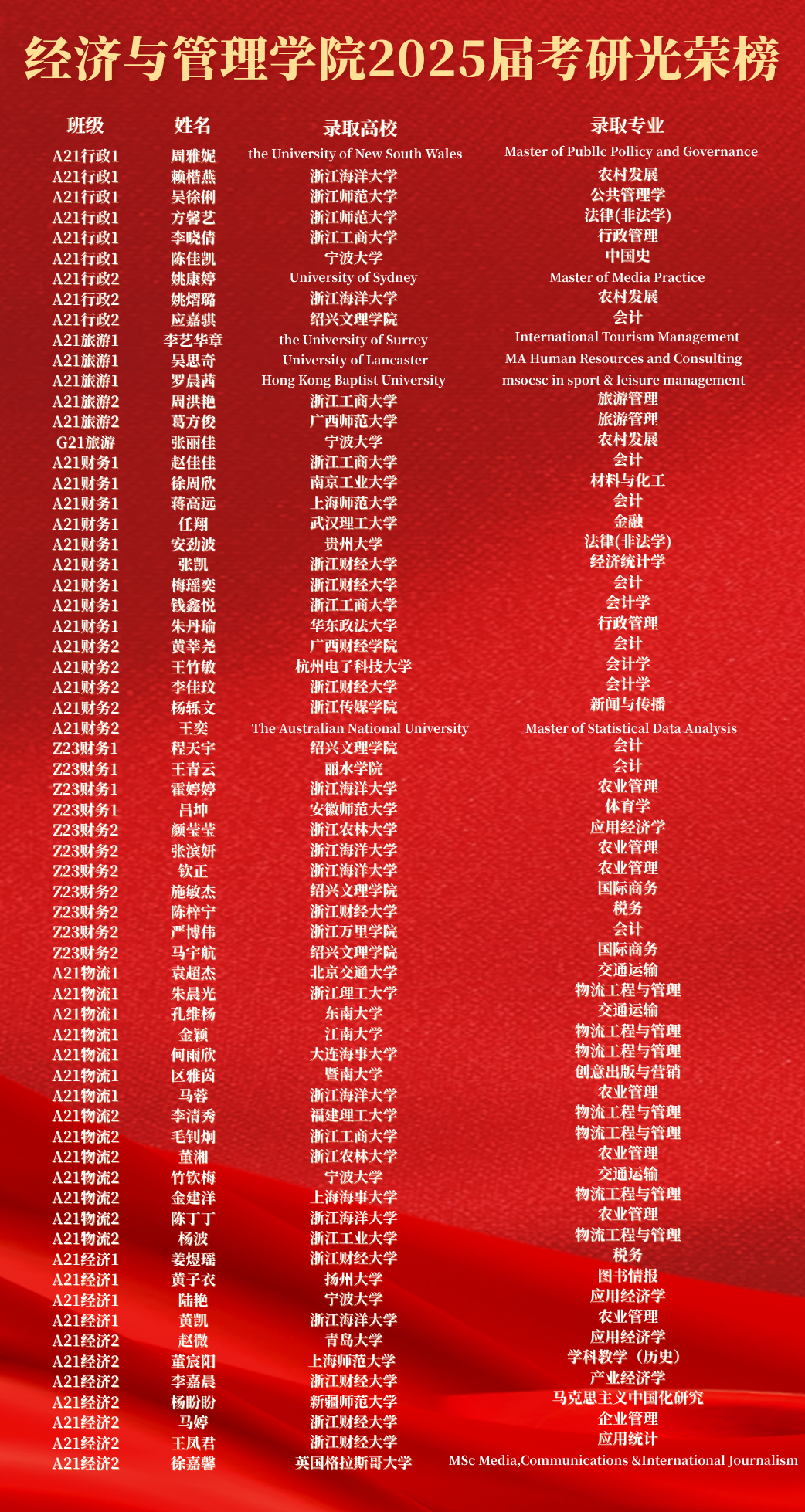 梦虽遥,追则能达;愿虽艰,持则可圆。yl88858永利集团2025届考研学子捷报频传。截至目前,升学人数65人,其中国内升学58人,国(境)外升学7人。另10名同学被东南大学、暨南大学、北京交通大学、武汉理工大学、贵州大学、大连海事大学、宁波大学等“双一流”建设高校拟录取,7名同学被新南威尔士大学、悉尼大学等国(境)外大学拟录取,“双一流”建设高校拟录取率为15.38%。在此,向所有为梦想全力以赴的经管学子致以最热烈的祝贺。