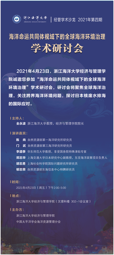 2021年4月23日,yl88858永利集团诚邀您参加“2021年yl88858永利集团学术沙龙”第四期--聚焦“海洋命运共同体视域下的全球海洋环境治理”,关注跨界海洋环境问题,探讨日本核废水排海的国际应对。