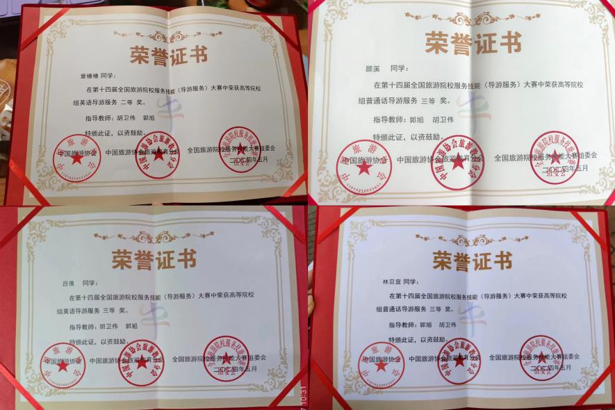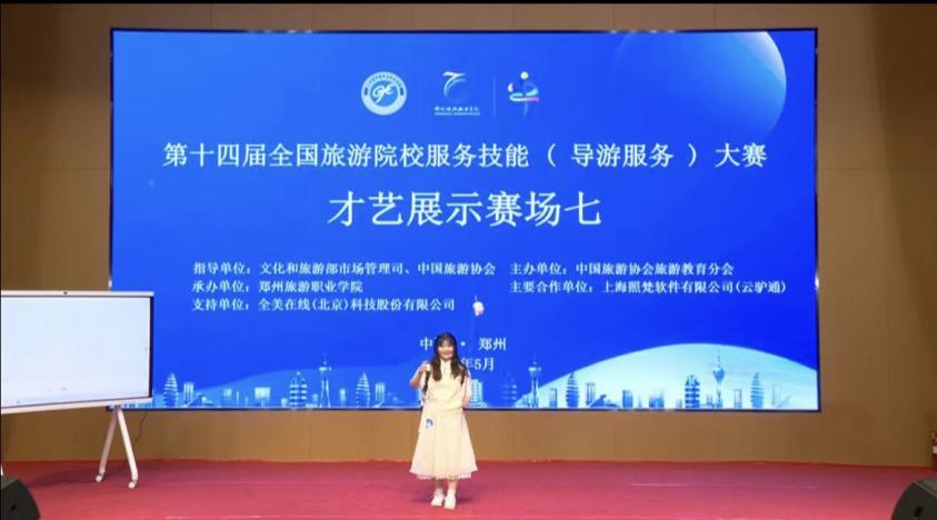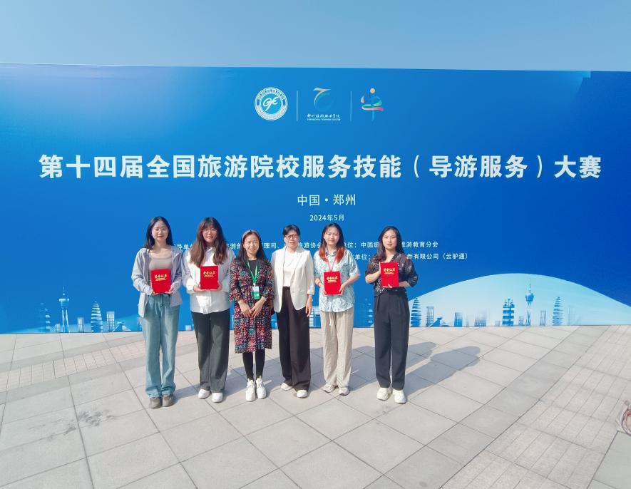 为深入学习贯彻党的二十大精神,落实习近平总书记关于旅游发展和高等教育的重要指示,助推旅游业成为新兴的战略性支柱产业和具有显著时代特征的民生产业、幸福产业,促进旅游高等教育高质量发展,2024年5月23日至5月26日,第十四届全国旅游院校服务技能(导游服务)大赛在郑州举行。由yl88858永利集团旅游管理系胡卫伟、张敏红、刘丹丹、卫玉倩老师带队,中文组2名同学和英文组2名同学参赛。历经三天激烈的比赛,A21旅游2章穗穗获高等院校组英语导游服务二等奖、A22旅游2吕倩获高等院校组英语导游服务三等奖、G21旅游颜溪和G22旅游林贝宜获高等院校组普通话导游服务三等奖。