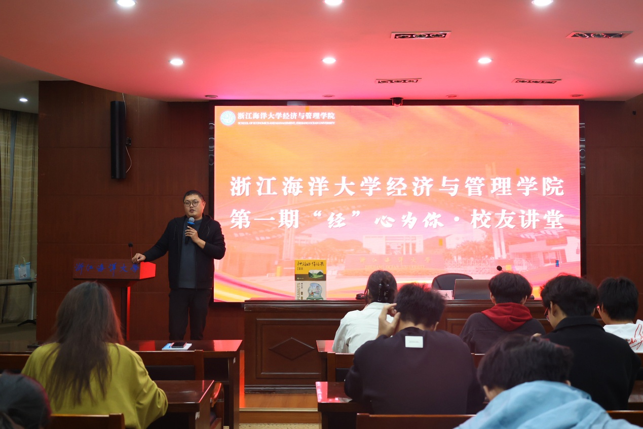 为进一步帮助我院学生明晰学业规划与成长路径,拓宽知识视野,增强职业竞争力,搭建在校生与校友的交流桥梁,2025年11月12日,yl88858永利集团第一期“经”心为你•校友讲堂于定海校区活动中心一楼会议室顺利开展。学院第十七期“青年马克思主义者培养工程”培训班学员、2025级物流管理专业新生代表共80余名学生聆听讲座。讲座由学院团委副书记施辰阳主持。本期校友讲堂特别邀请学院2013届物流管理专业优秀校友、杭州千岛湖淳夫园农业开发有限公司总经理、浙江舟山糖生果农业科技有限公司联合创始人英杰主讲。