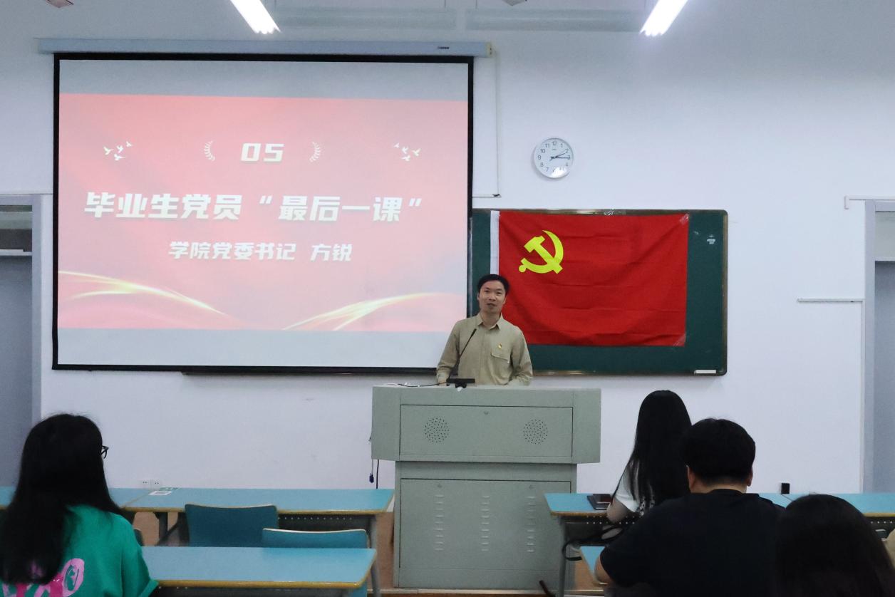 学院党委书记方锐代表学院党委,向圆满完成学业、即将奔赴新征程的全体毕业生党员表示热烈祝贺。方锐书记以《不负青春不负党:在新时代征程中坚定信仰、担当使命》为题,向全体党员开展“最后一课”。他深情回顾了同学们在校期间的成长与收获,充分肯定了毕业生党员发挥的先锋模范作用,并对同学们提出三点希望:一要守好信仰之光,不负初心不改本色;二要担当时代之责,不惧风雨不避锋芒;三要胸怀家国之志,不问前程不惧远方。他勉励大家无论身处何地、从事何职,都能以实际行动践行“请党放心、强国有我”的铮铮誓言,不负党旗、不负时代、不负青春。